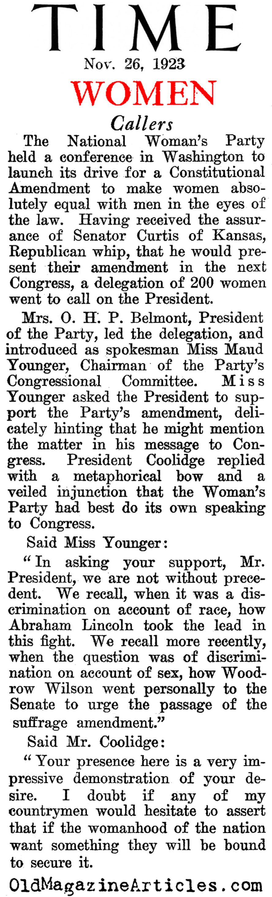 KEY WORDS: National Woman’s Party sought complete equality with men 1923,National Woman’s Party wanted to amend the US constitution 1923,legislative battle waged by National Woman’s Party 1923,US Senator Charles Curtis of Kansas ally of the National Woman’s Party 1923