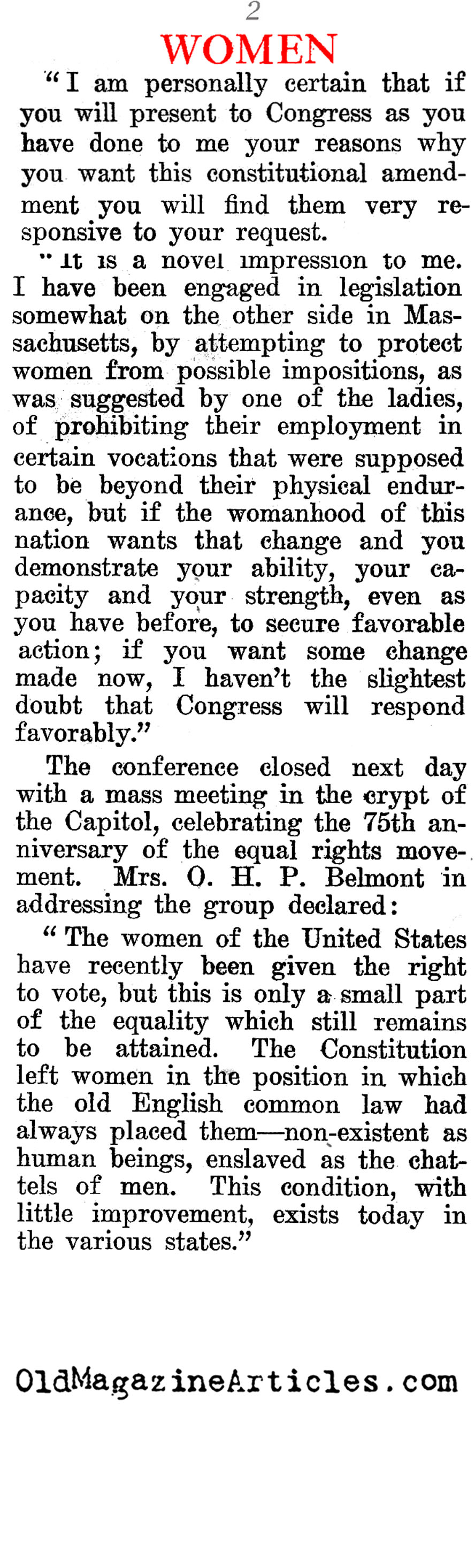 have recently been given the right to vote, but this is only a small part of the equality which still remains to be attained. The Constitution left women in the position in which the old English common law had always placed them– non-existent as human beings, enslaved as the chattels of men. This condition, with little improvement, exists today in the various states…Having received the assurance of Senator Curtis of Kansas, Republican Whip, that he would present their amendment in the next Congress, a delegation of 200 women went to call on [President Coolidge].”