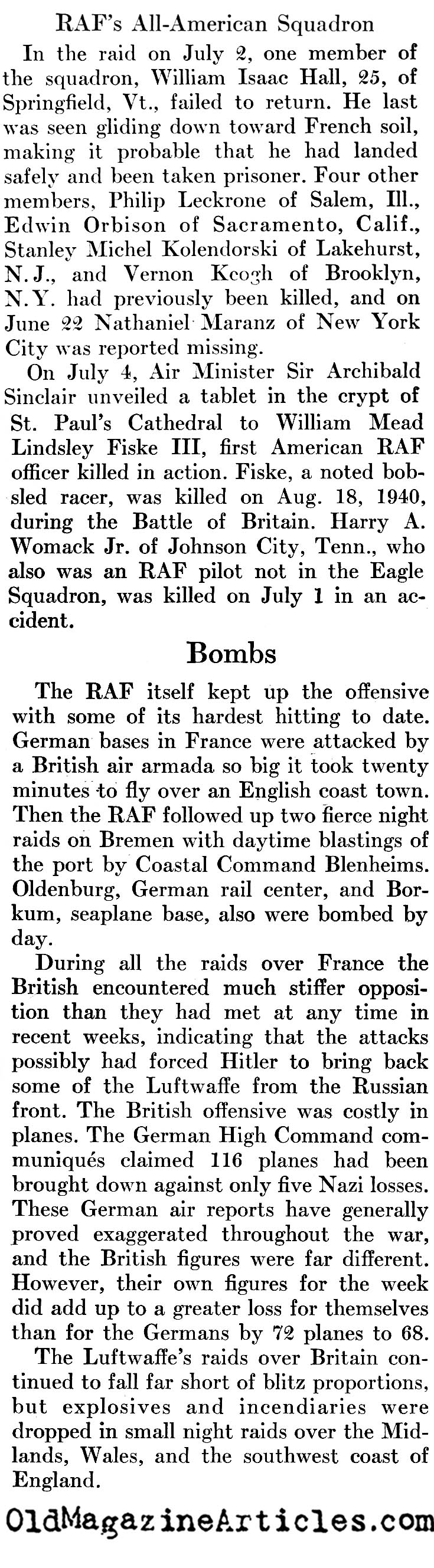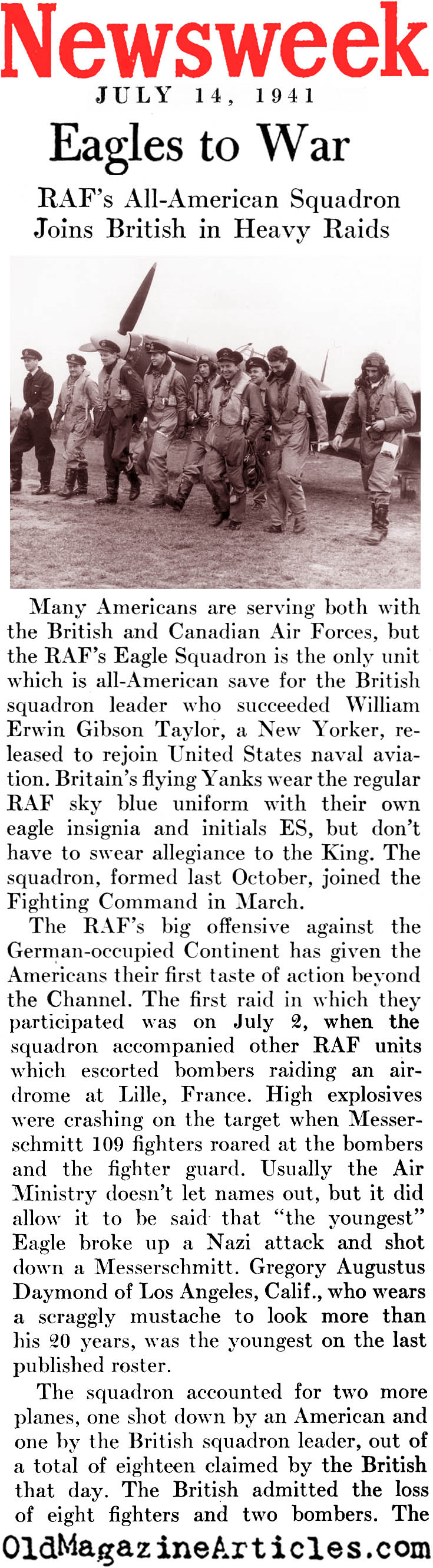 “The first raid in which they participated was on July 2 [1941], when the squadron accompanied other RAF units which escorted bombers raiding an airdrome at Lille, France. High explosives were crashing on the target when Messerschmitt 109 fighters roared at the bombers and the fighter guard… The youngest Eagle broke the Nazi attack and shot down a Messerschmitt.”