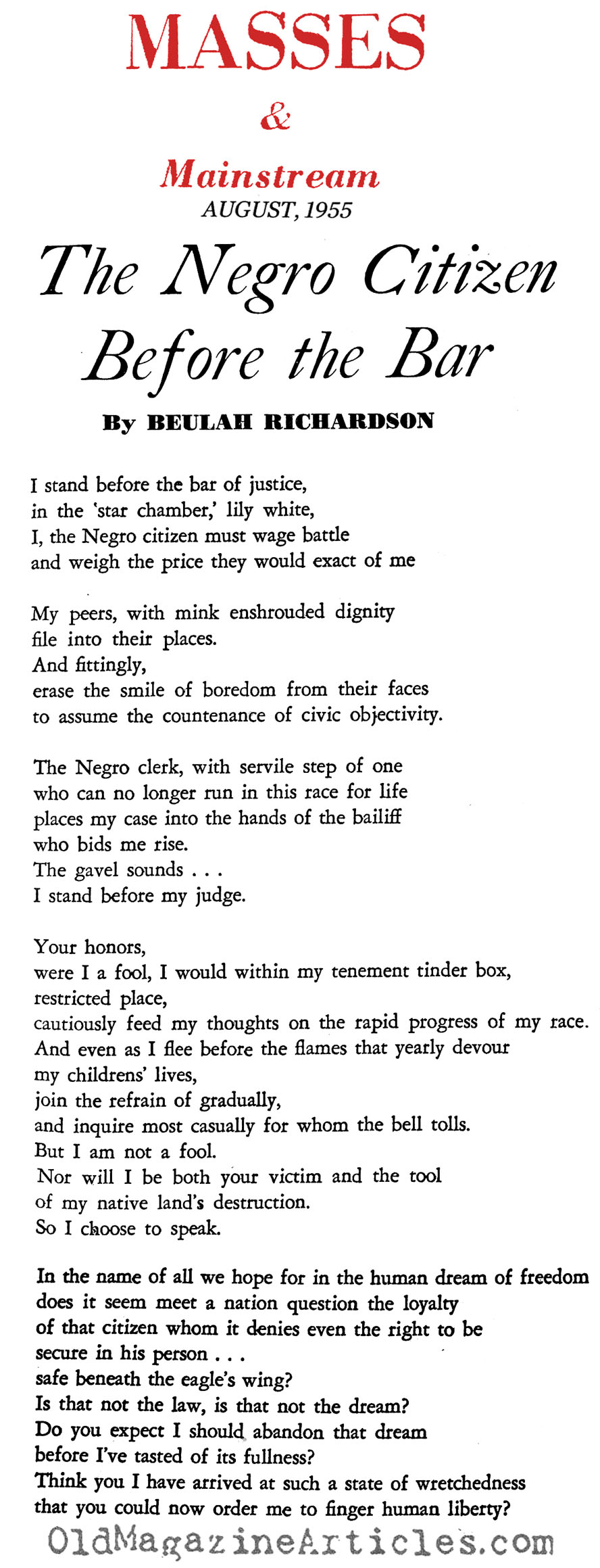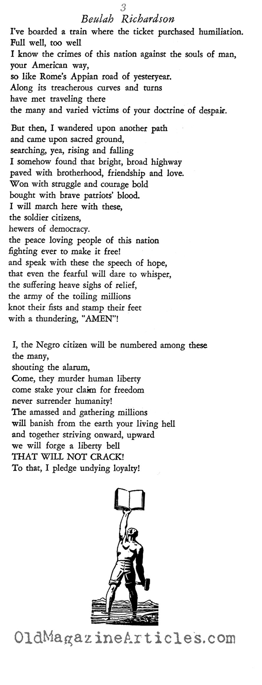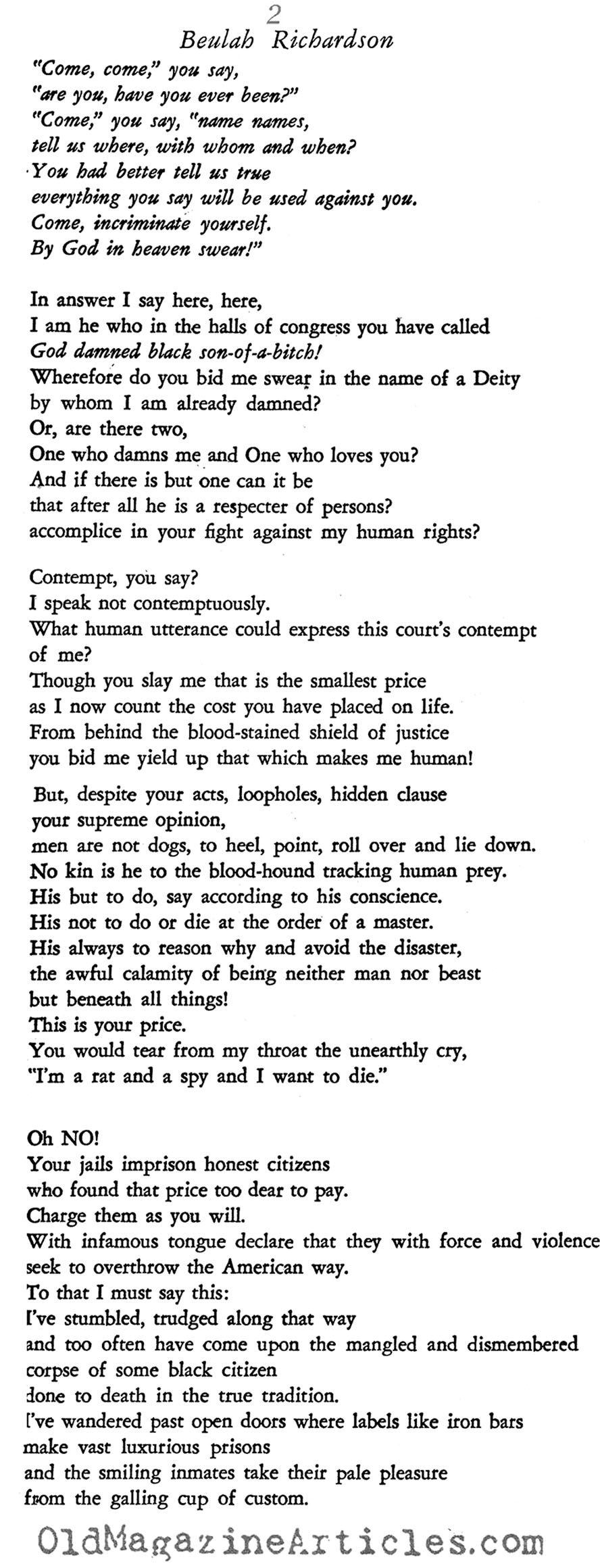 In the Digital Age, Beulah Elizabeth Richardson (1920 – 2000: stage name Beah Richards) is largely remembered as an award-winning actress, but it has widely been forgotten that she was also a poet and playwright. The attached poem is an honest expression of her reaction to the tyranny experienced by too many African Americans.