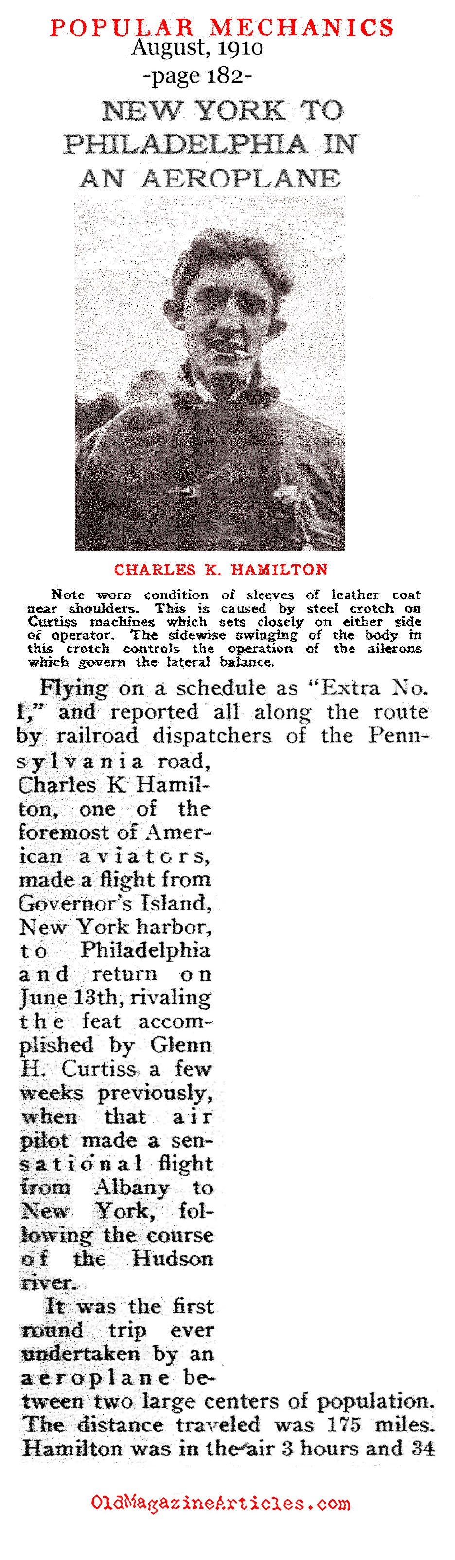 Attached is a 1910 magazine article that reported that pioneer aviator Charles Hamilton (1886 – 1914) made the first round-trip flight from Philadelphia to New York and back again flying a Curtis bi-plane: