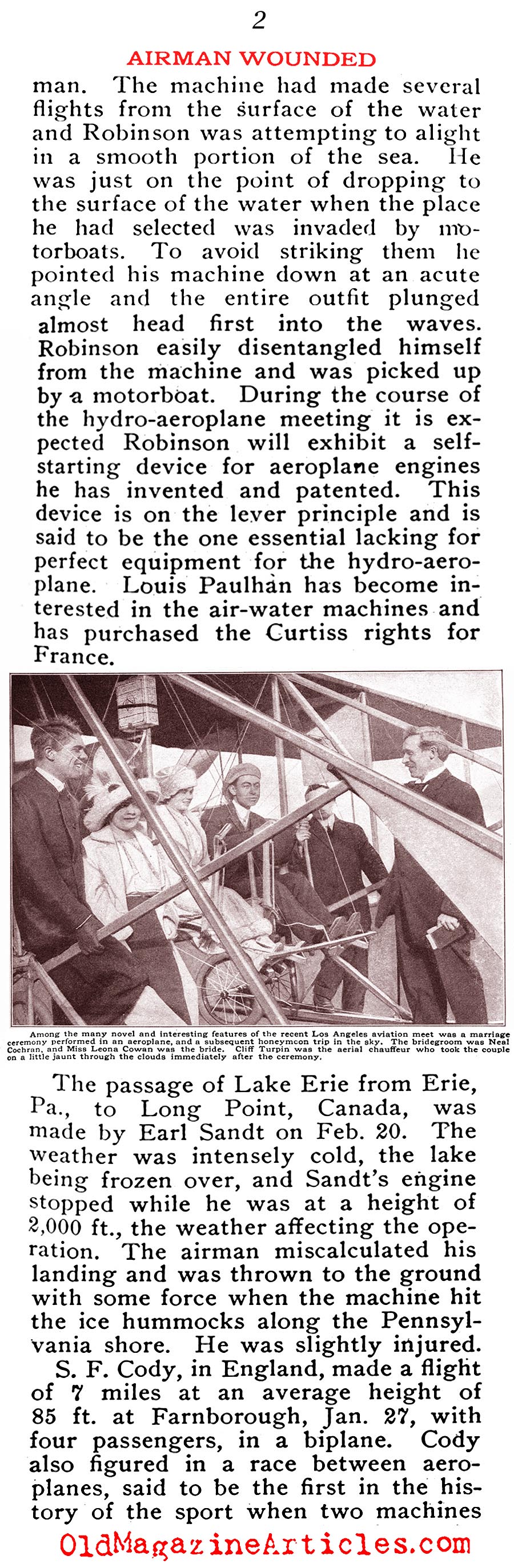 Also covered in the same article is news concerning the Curtiss Hydro-plane and the first airborne wedding ceremony.
