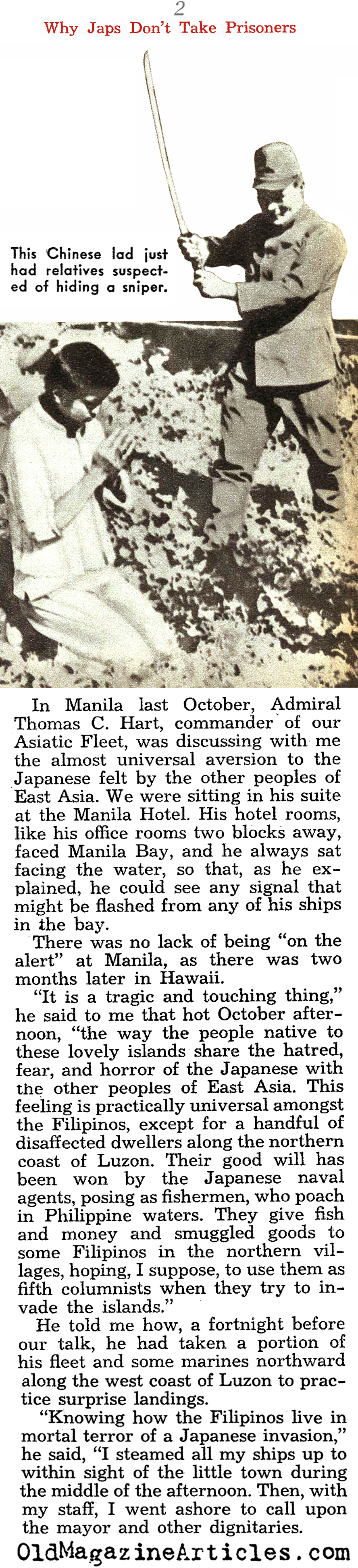 “Japan has been blood-drunk for more than a decade – ever since the Japanese invaded Manchuria in September, 1931. Without a pause, they have been killing and burning and raping in China. In four and a half years of warfare there, the Japanese have taken almost no prisoners. No one knows of the existence of a single concentration or internment camp in all of Japanese-occupied China. Chinese prisoners of war are shot, excepting captured officers or flyers from whom information may be extorted by torture, after which they are shot in the back of the head. The like is done to Chinese wounded left on the battlefields.”</