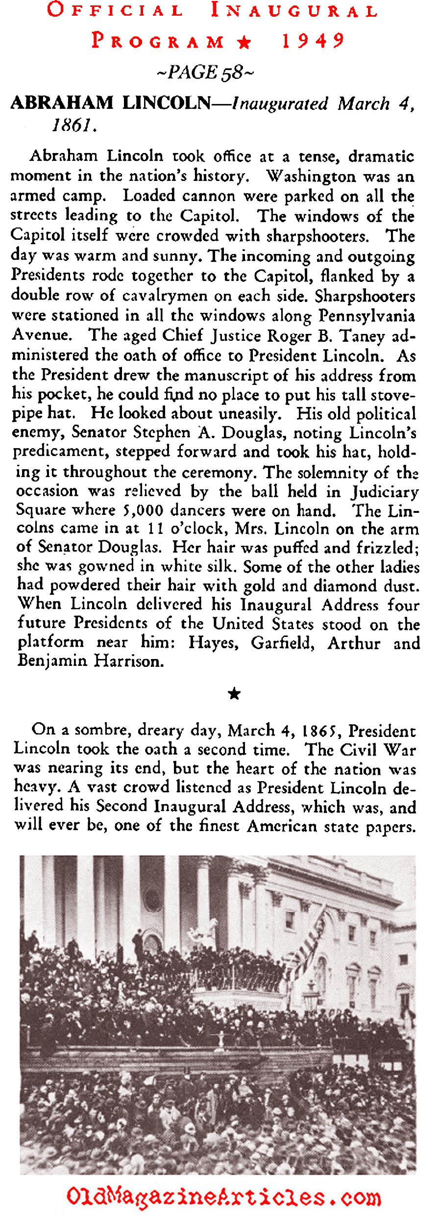 Lovingly ripped from the binding of the 1949 inaugural program were these pithy paragraphs describing the somber moods of the two Lincoln inaugurals. The anonymous author noted that