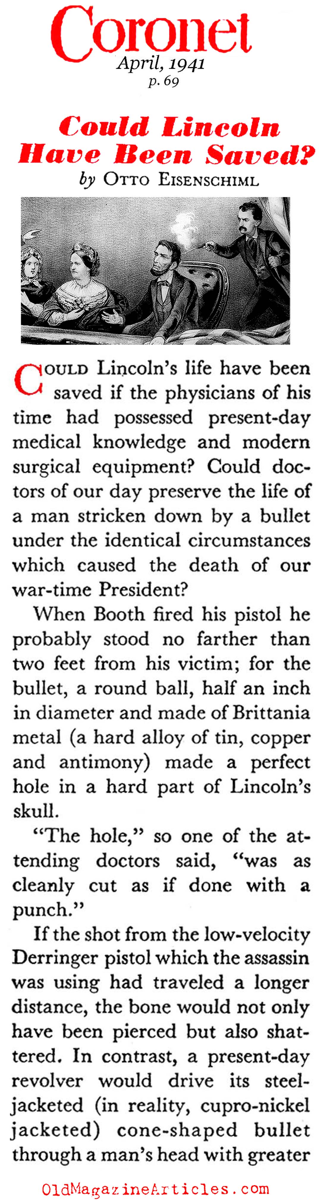 Within the confines of the attached PDF file you’ll read a good deal of information on the matter concerning the physical damage that was wrought in the wake of the most famous head shot in ballistic history: the assassination of Abraham Lincoln – as well as the various life-prolonging measures that were implemented by the 23 year-old doctor who was first on the scene.