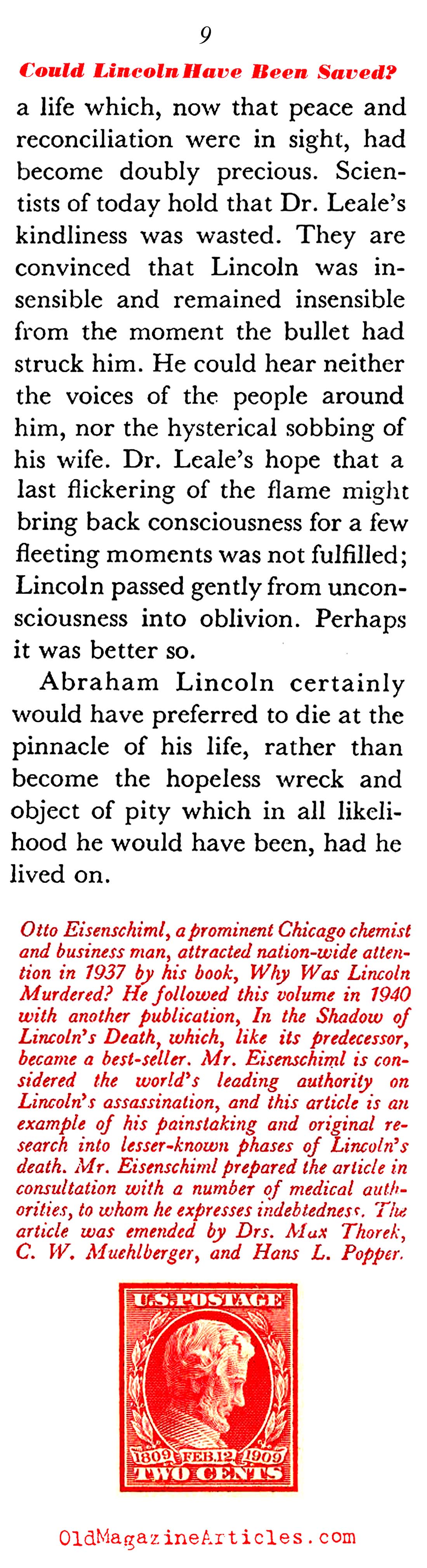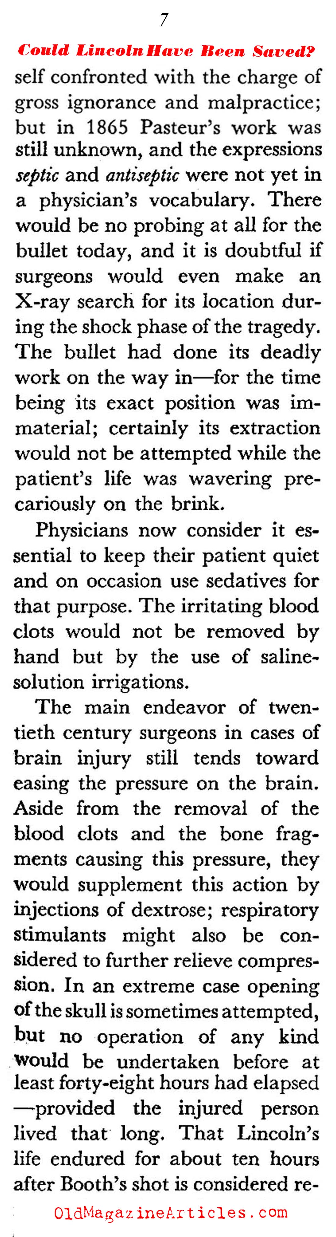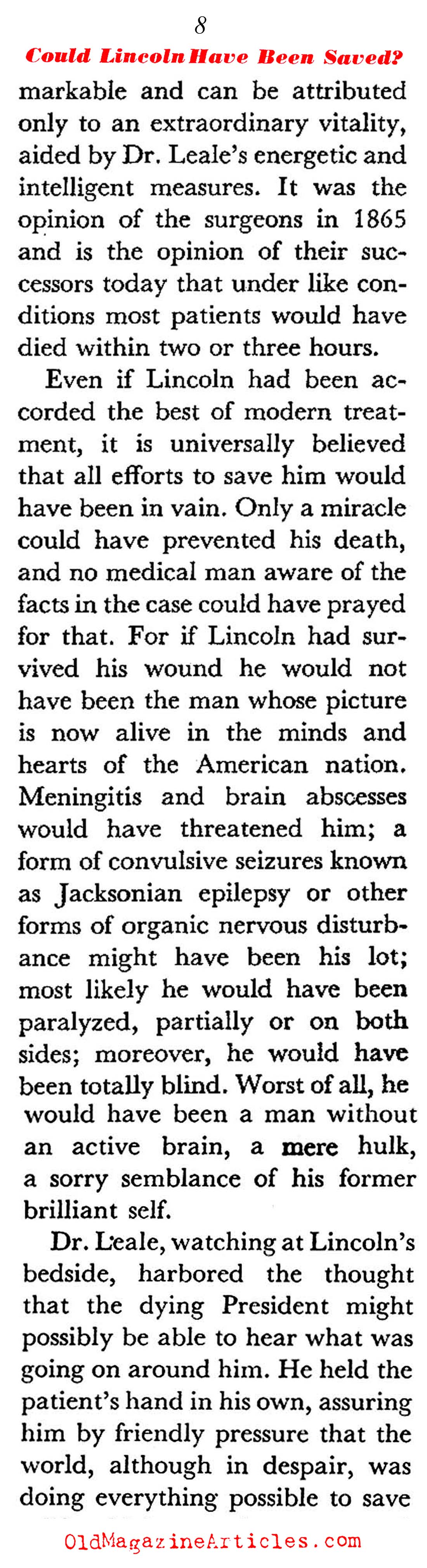 “If Lincoln had survived his wound he would not have been the man whose picture is now alive in the minds and hearts of the American nation. Meningitis and brain abscesses would have threatened him; a form of convulsive seizures known as Jacksonian epilepsy or other forms of organic nervous disturbance might have been his lot. Most likely he would have been paralyzed, partially or on both sides; moreover, he would have been totally blind. Worst of all, he would have been a man without an active brain, a mere hulk, a sorry semblance of his former brilliant self.”