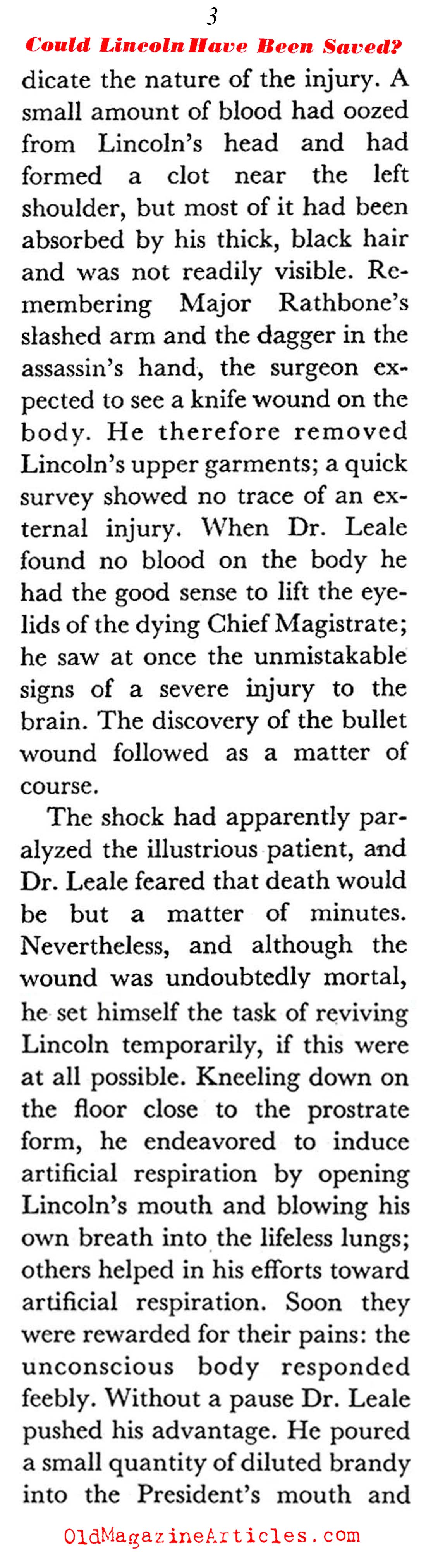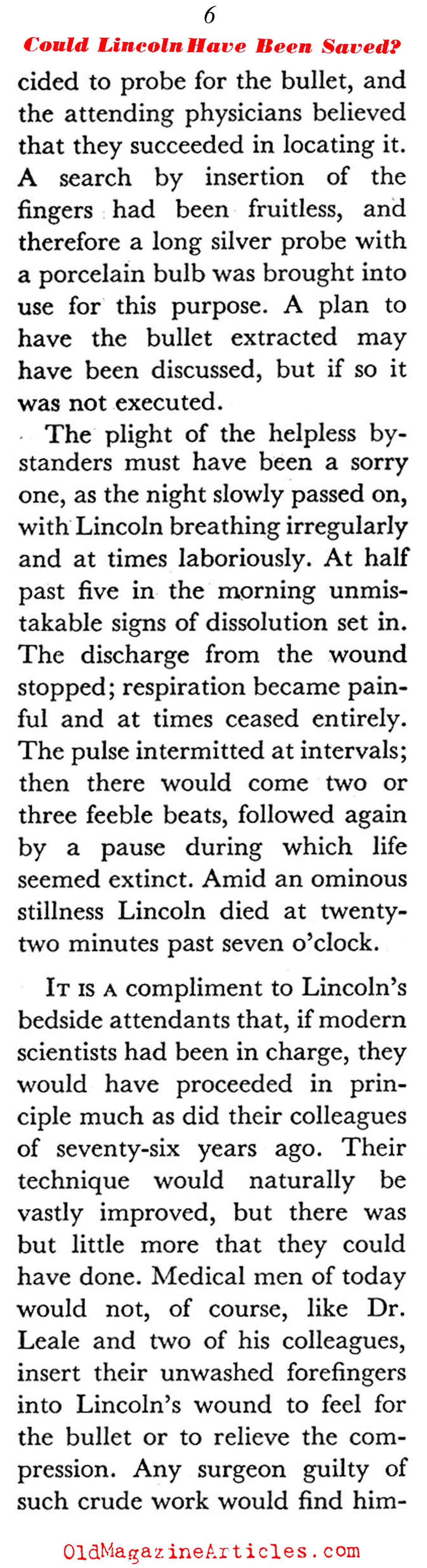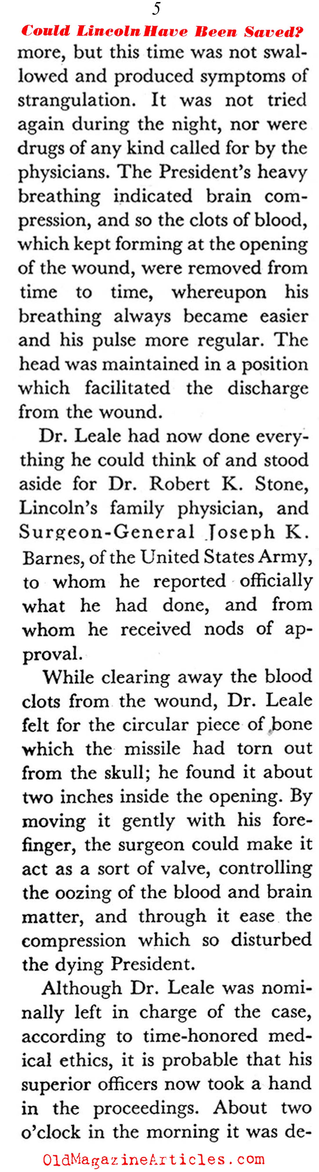“If Lincoln had survived his wound he would not have been the man whose picture is now alive in the minds and hearts of the American nation. Meningitis and brain abscesses would have threatened him; a form of convulsive seizures known as Jacksonian epilepsy or other forms of organic nervous disturbance might have been his lot. Most likely he would have been paralyzed, partially or on both sides; moreover, he would have been totally blind. Worst of all, he would have been a man without an active brain, a mere hulk, a sorry semblance of his former brilliant self.”