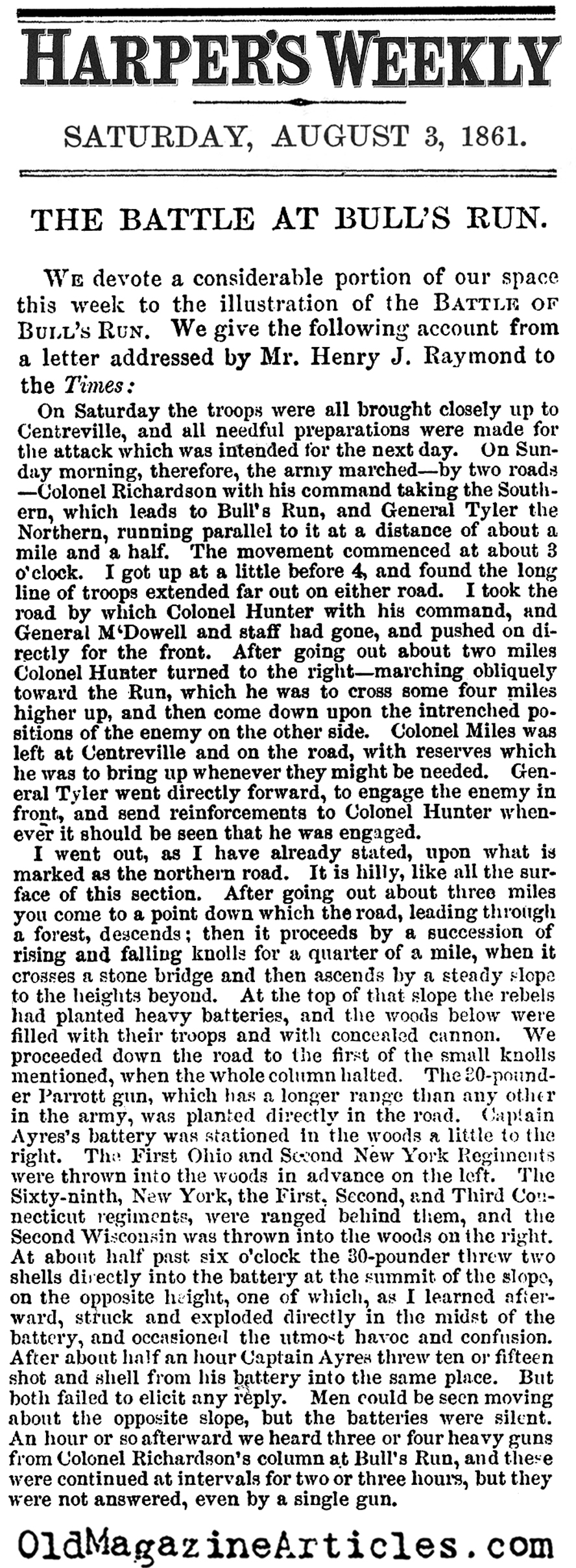 Posted on the right is the eyewitness report of the U.S. Army rout at the first battle of the Civil War, Bull Run (July 21, 1861). It was written by Henry J. Raymond (1820 – 1869), founding editor-in-chief of The New York Times: