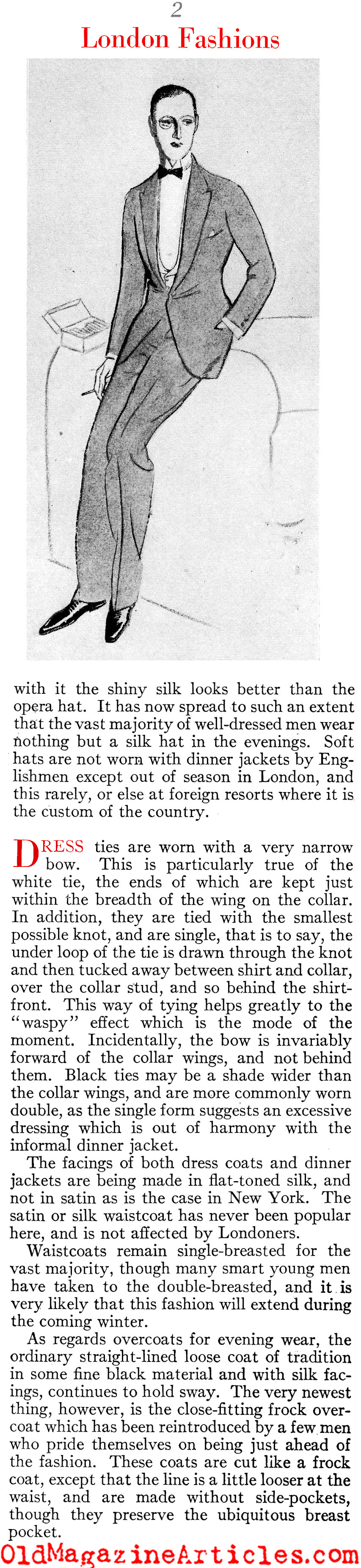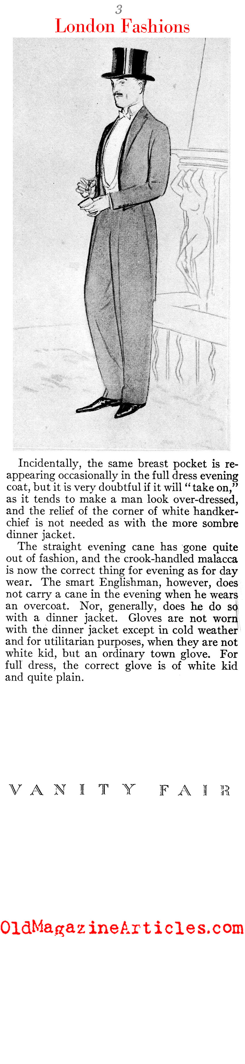 conservative than in dress clothes, and the changes from year to year are of the slightest…The smart Englishman, however, does not carry a cane in the evening when he wears an overcoat. Nor does he wear do so with a dinner jacket. Gloves are not worn with the dinner jacket except in cold weather and for utilitarian purposes, when they are not white kid, but an ordinary town glove. For full dress, the correct glove is of white kid and quite plain.”