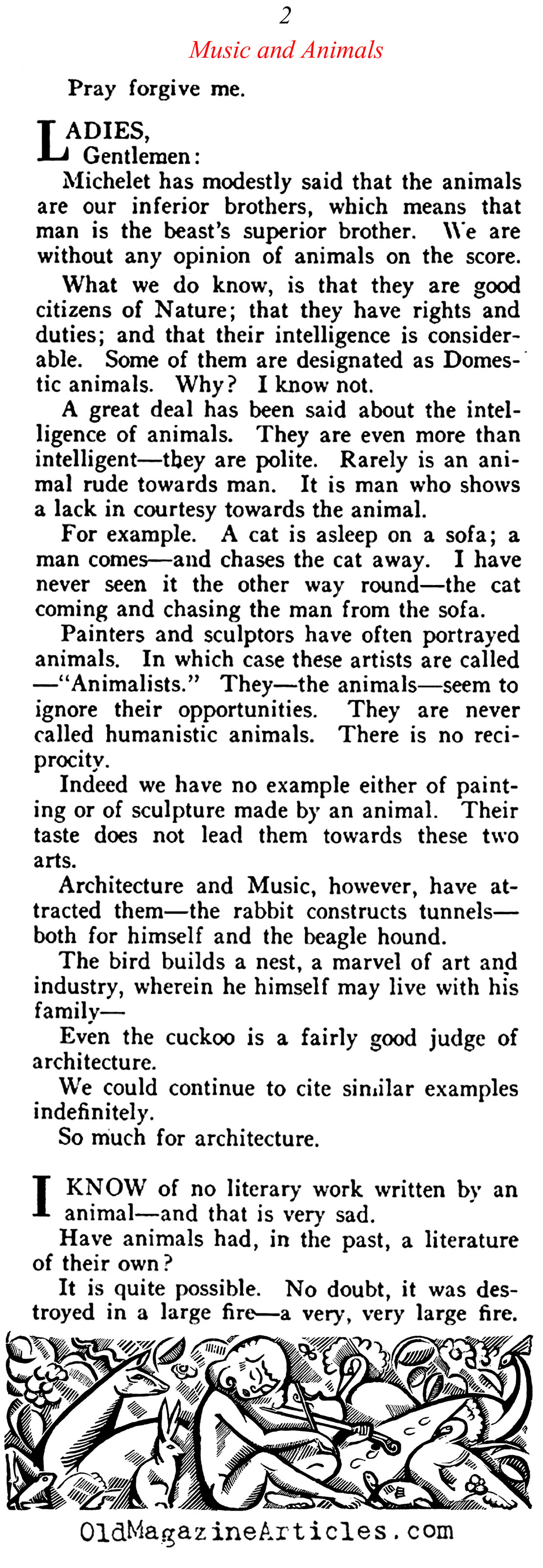 This article is another among the several tongue and cheek essays that the French composer Eric Satie (1866 – 1925) contributed for the amusement of the fun-loving readers of VANITY FAIR MAGAZINE. Published just three years prior to his death, the article is beautifully illustrated and stands as one solid page of pure silliness in which Satie considered the place of art in the animal kingdom, and concludes that of all the arts, architecture and music are the only two creative endeavors that the creatures of the field ever seem able to embrace: