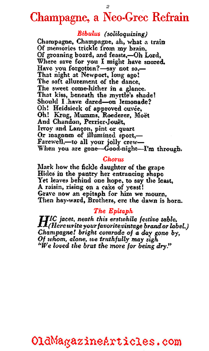 This fashionable little poem appeared on the chic pages of VANITY FAIR magazine in 1919; a time when the long shadow of Prohibition was about to spread across the fruited plains of the United States, and from sea to shining sea, the land would be barren until 1933. Soberly, the poet sings “good-bye and farewell” to champagne; pitying all those poor gay blades who must now stroll the boulevards with nothing more potent than lemonade on their collective breathes.