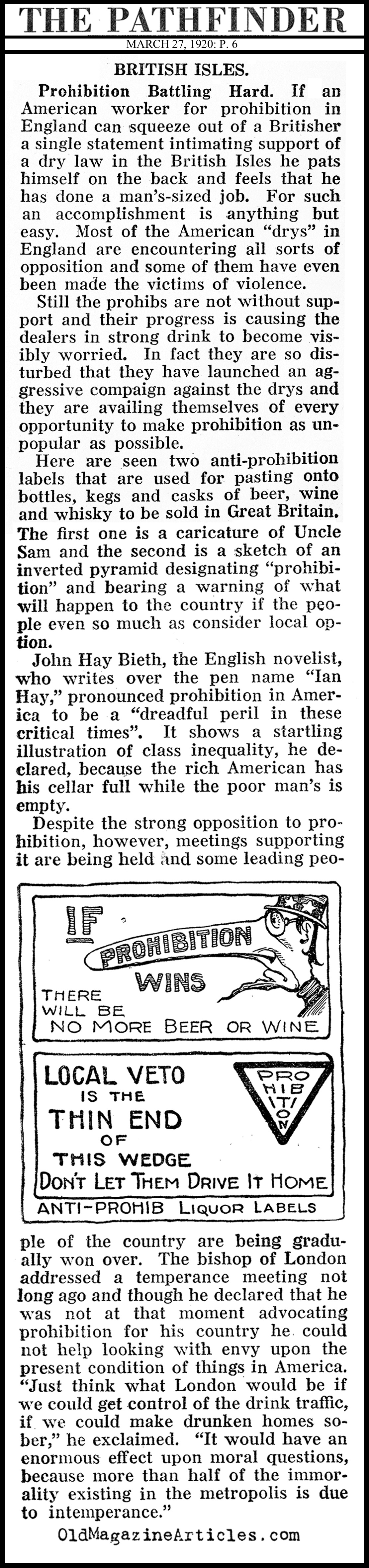 Prohibition History The Prohibition Movement in Britain • Pathfinder Magazine, 1920 • KEY WORDS: Prohibition Movement in Britain,author John Hay Beith anti-temperance movement,1920 anti-temperance movement in UK,short-lived UK Prohibition Movement,efforts to prohibit alcohol in UK 1920