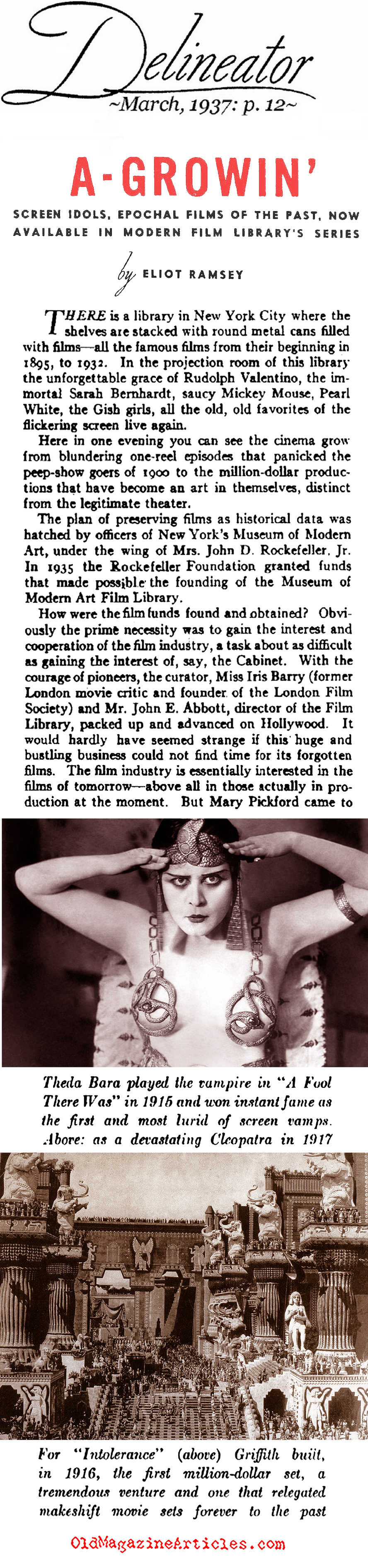 Living, as we do, in the age of Apple TV and Netflicks the whole idea of being able to watch a film that is twenty years old does not seem to be a terribly queer idea. Yet for the folks who first read the attached Delineator Magazine article from 1937, it was a time when there weren’t any motion picture revival theaters whatever; once a film had left the local theater, it was indeed gone and highly unlikely to be seen again. The reigning film studios were not likely to establish a public repository for such purposes; they are always interested in tomorrow’s movies, not yesterday’s. This article is about the 1935 founding of the Museum of Modern Art Film Library.