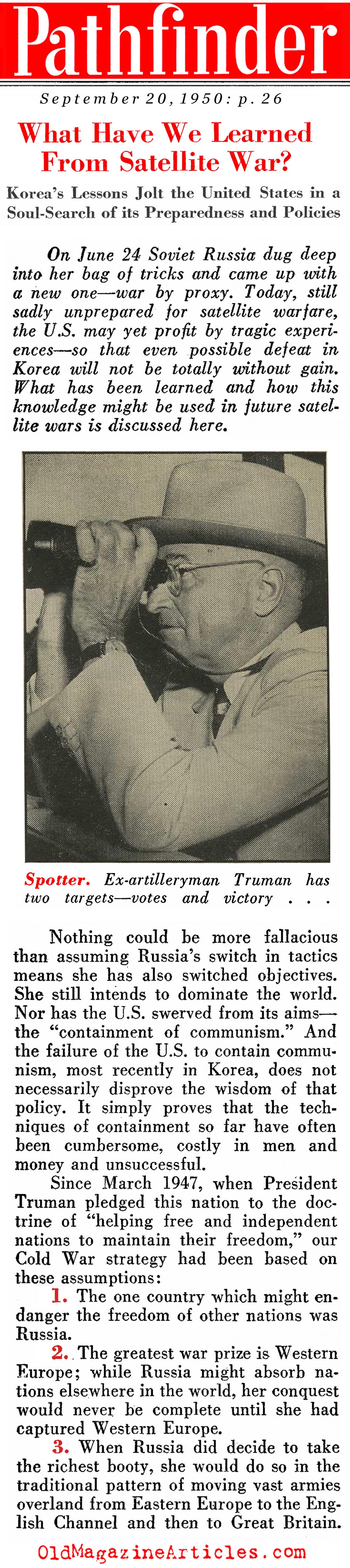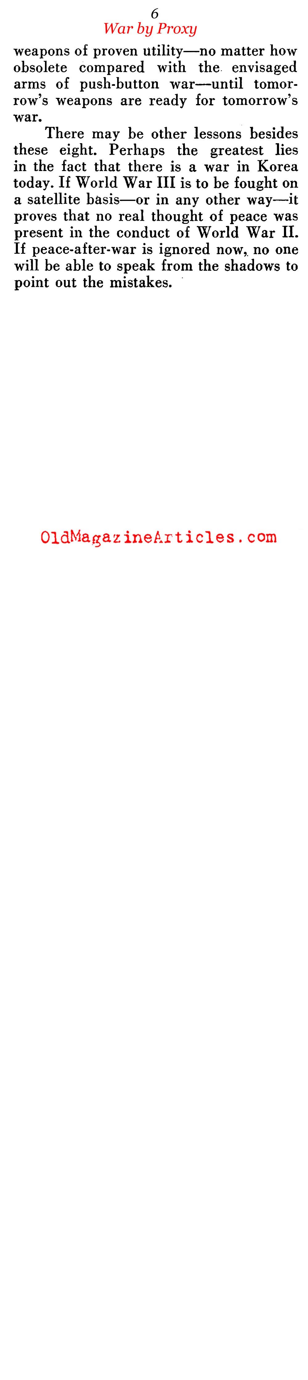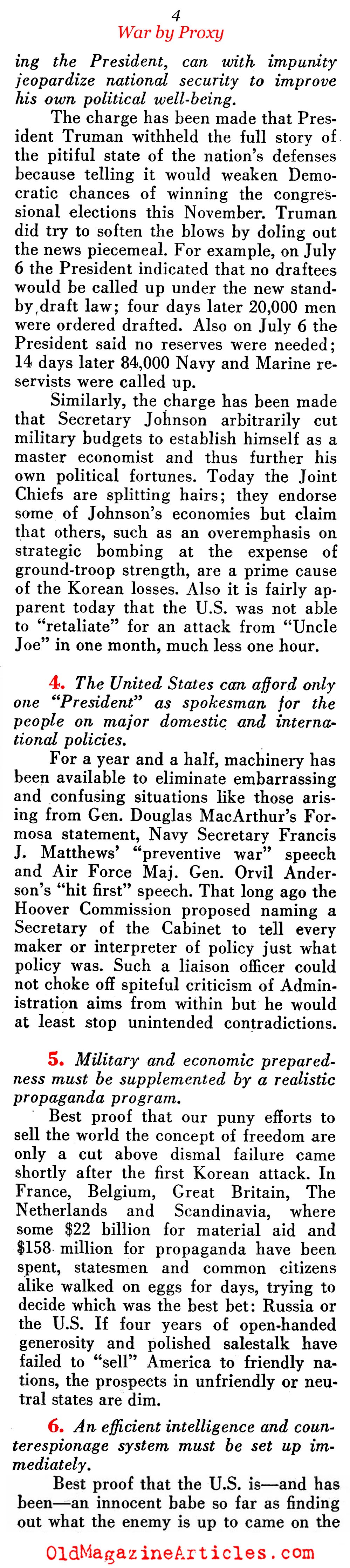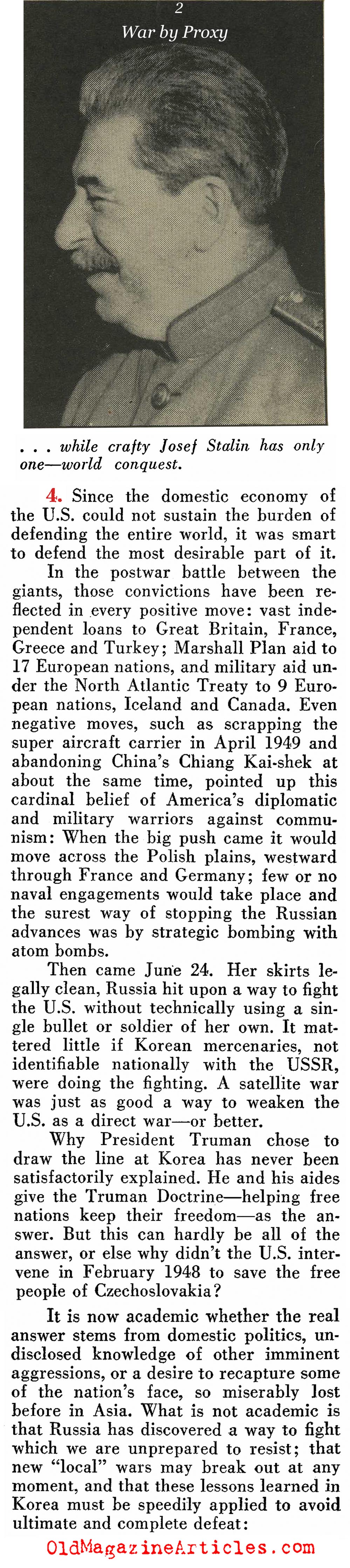 “Then came June 24 [1950]. Her skirts legally clean, Russia hit upon a way to fight the U.S. without technically using a single bullet or soldier of her own. It mattered little if Korean mercenaries, not identifiable nationally with the USSR, were doing the fighting. A satellite war was just as good a way to weaken the U.S. as a direct war – if not better.”