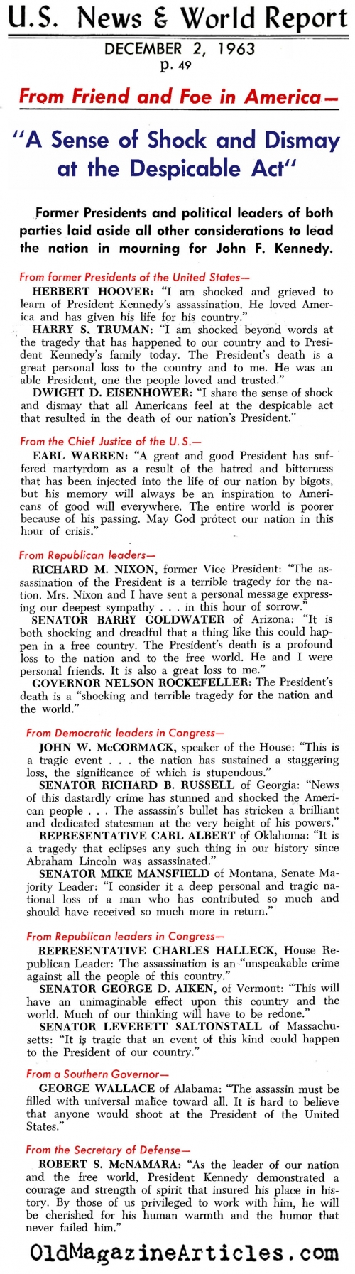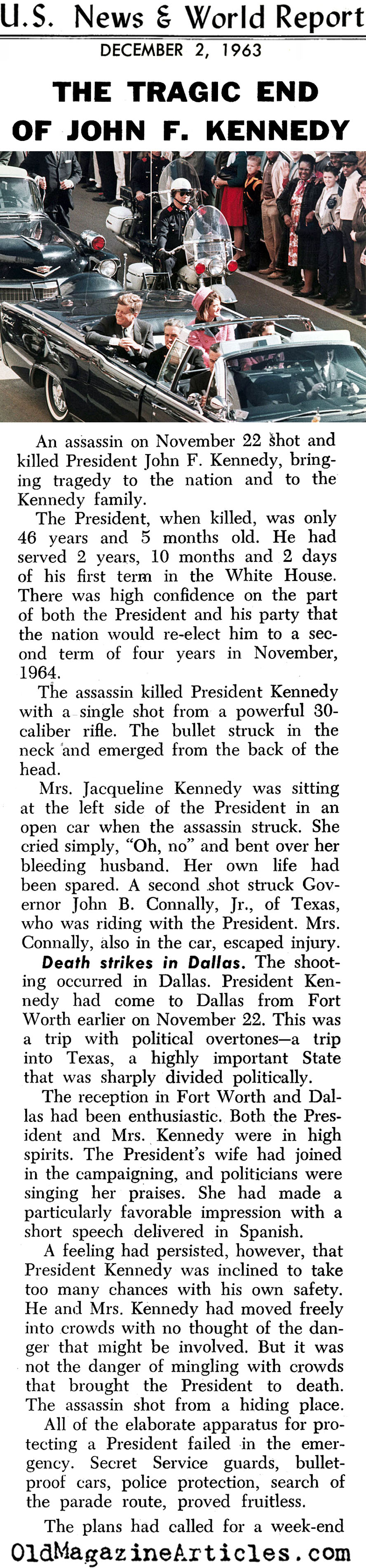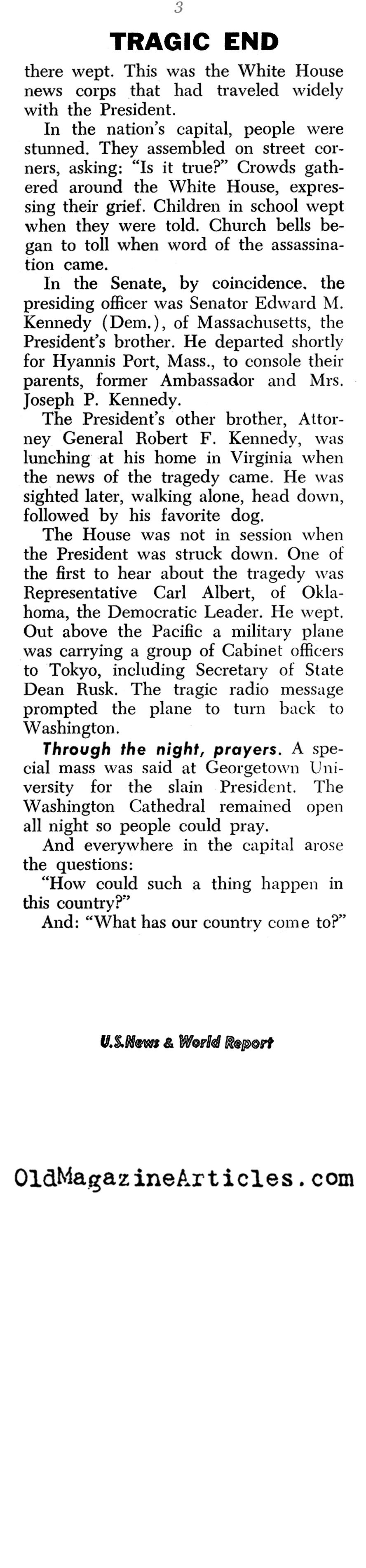 “The assassin killed President Kennedy with a single shot from a powerful 30-caliber rifle. The bullet struck in the neck and emerged from the back of the head…. The tragic death sent tremors all through the world. When Malcom Kilduff, Assistant White House Press Secretary, announced the President’s death to newsmen in Dallas hospital, everyone there wept. This was the White House news corps that had traveled widely with the President… A special mass was said at Georgetown University for the slain President. The Washington Cathedral remained open all night so people could pray.”