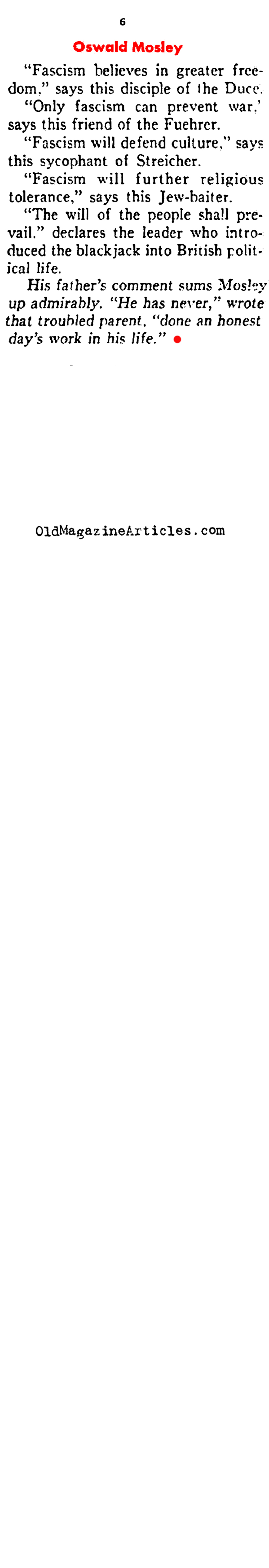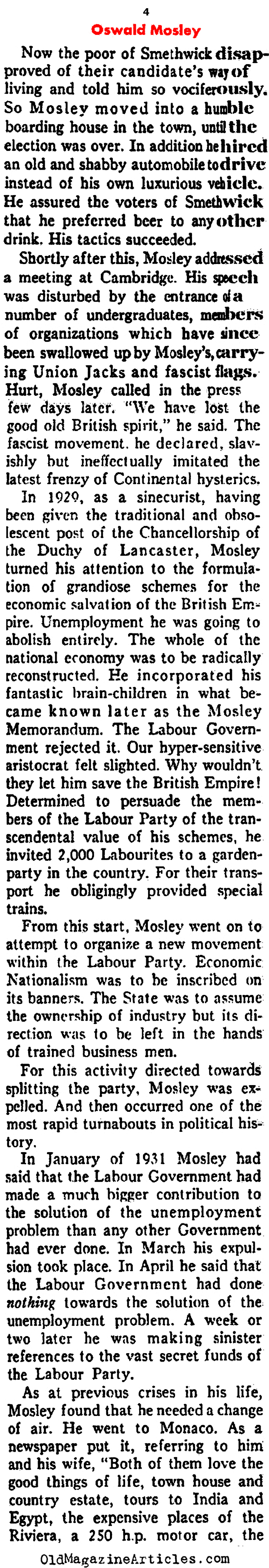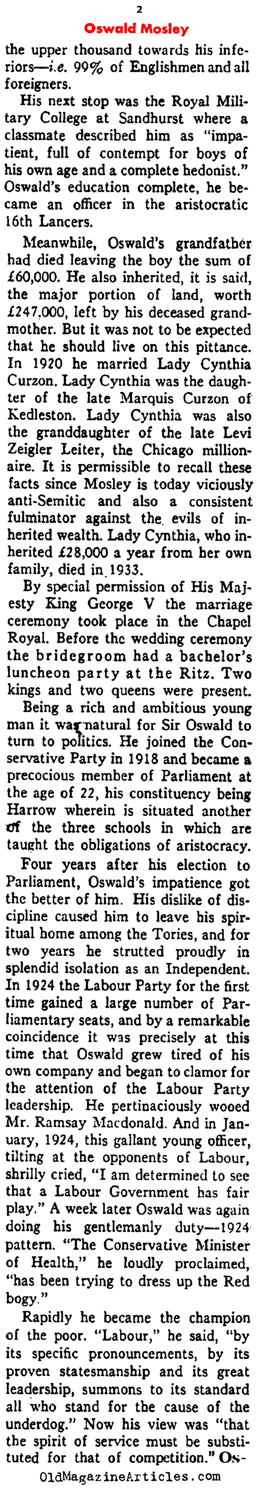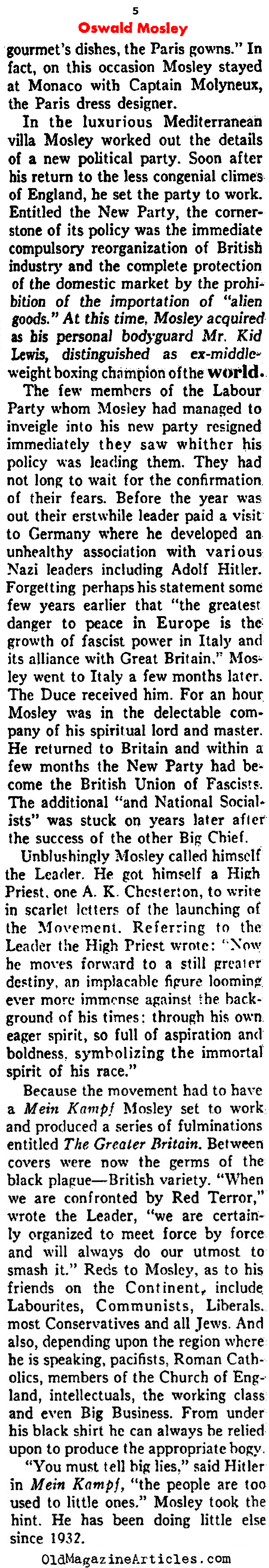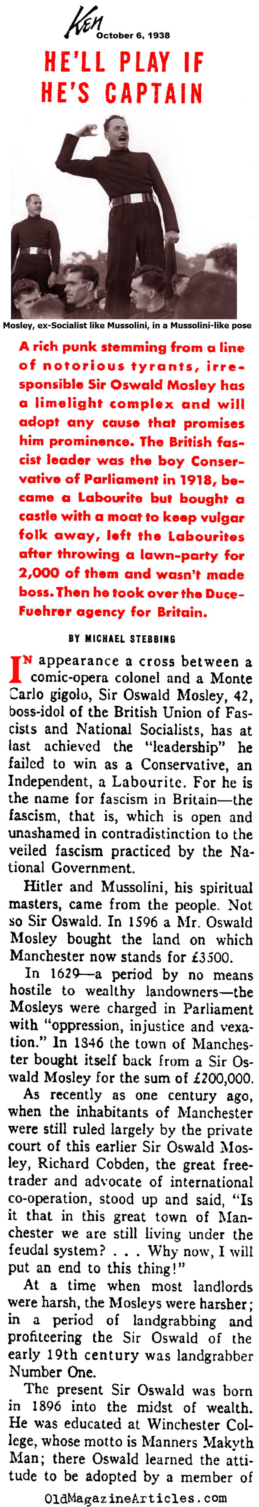 KEY WORDS: European Fascists,British Fascist Oswald Mosely Newspaper Article 1938,Oswald Mosely magazine profile 1938,Oswald Mosely early life and career magazine article,Oswald Mosely article from 1938,Oswald Mosely and the foundations of British Fascism 1938,Oswald Mosely and the foundations of UK Fascism 1938,Oswald Mosely sympathetic towrd Hitler and Mussolini 1938,BUF and Oswald Mosely 1938,establishment of BUF in UK 1930s,Oswald Mosely established BUF,Oswald Mosely founder of British Union of Fascists
