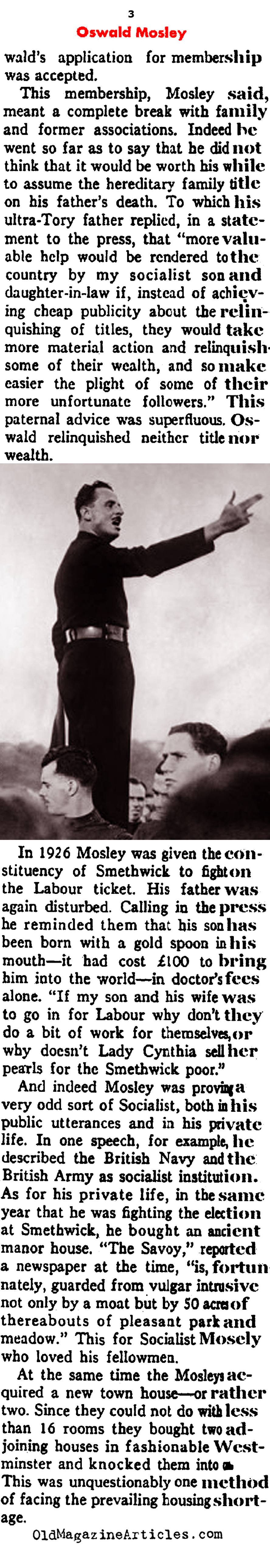 Oswald Mosley (1896 – 1980) was one of these men; he was the founder of the British Union of Fascists. The attached article outlines much of his life and political career up to the year 1938, with heavy emphasis concerning some of the least the admirable aspects of his character