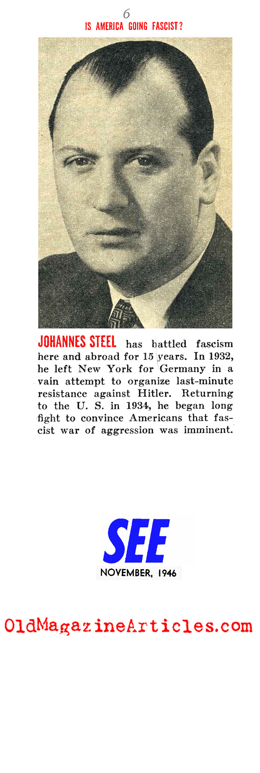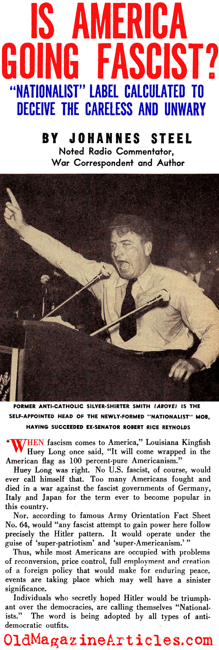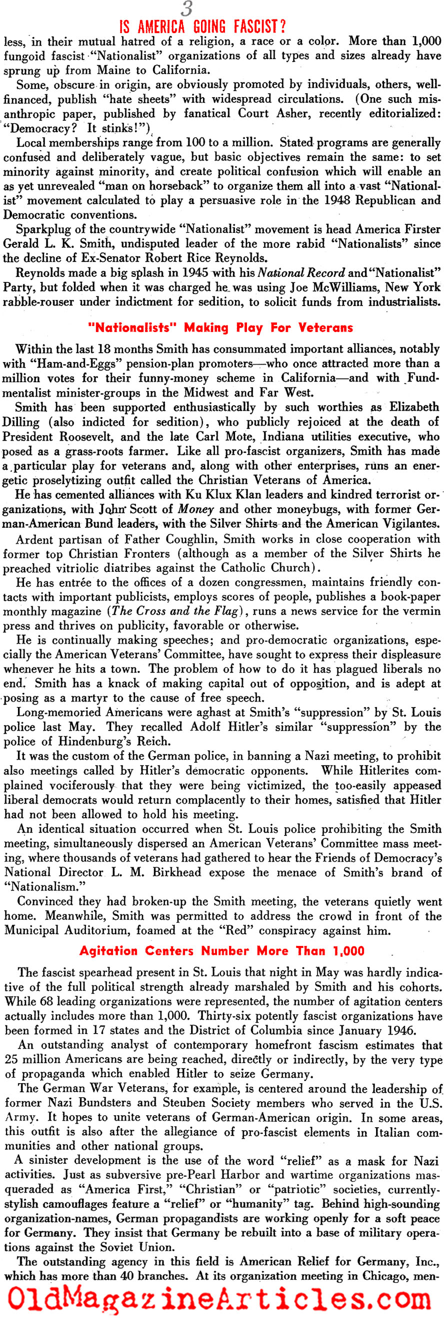 KEY WORDS: reporter Johannes Steel magazine article about the rise of american fascism,war correspondent Johannes Steel list of fascist political groups in America 1946,Christian Front Southerners magazine article 1946,Far Westerners magazine article 1946,Christian Veterans of America magazine article 1946,American Vigilantes magazine article 1946,Steuben Society magazine article 1946,America First magazine article 1946,American Relief for Germany magazine article 1946,Gentile Cooperative League magazine article 1946,Association of Georgia Klans magazine article 1946,silver shirts magazine article 1946,ARG magazine article 1946