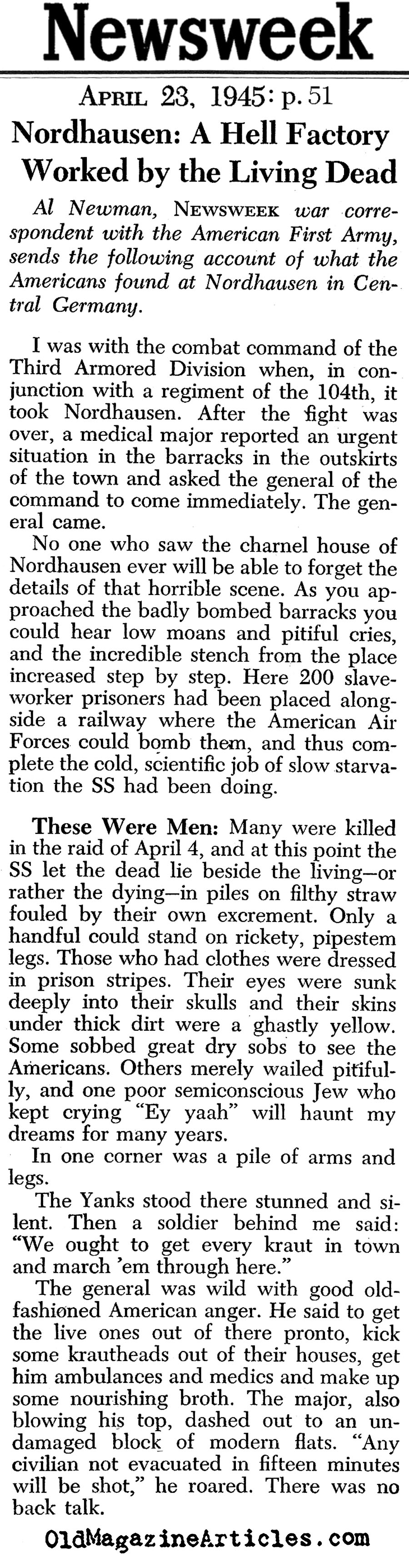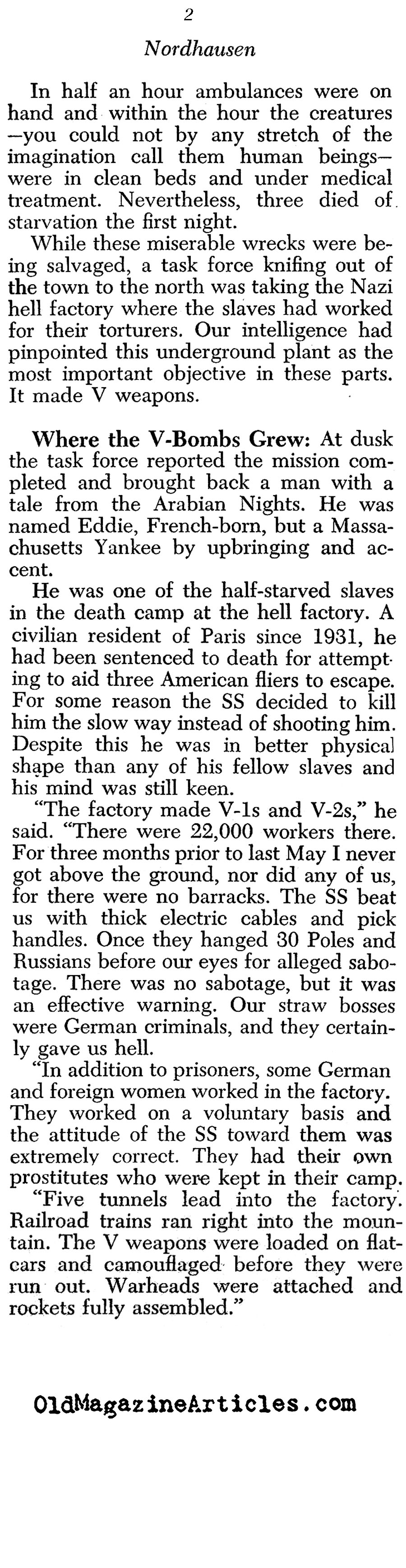 “No one who saw the charnel house of Nordhausen ever will be able to forget the details of that horrible scene. As you approached the badly bombed barracks you could hear low moans and pitiful cries, and the incredible stench from the place increased step by step. Here, 200 slave-worker prisoners had been placed alongside a railway where the American Air Forces could bomb them, and thus complete the cold, scientific job of slow starvation the SS had been doing… ‘The factory made V-1 and V2 [rockets].'”