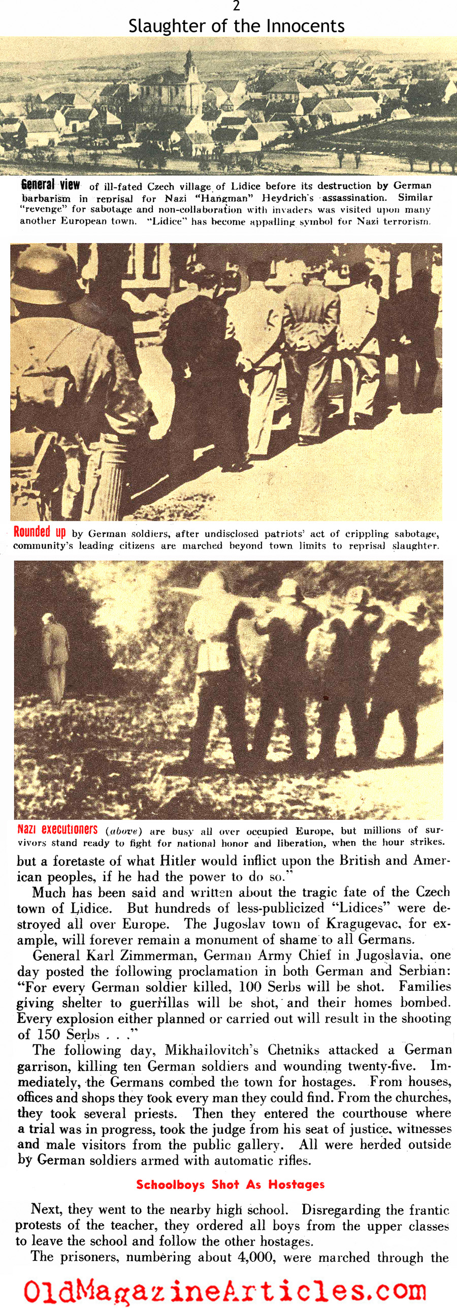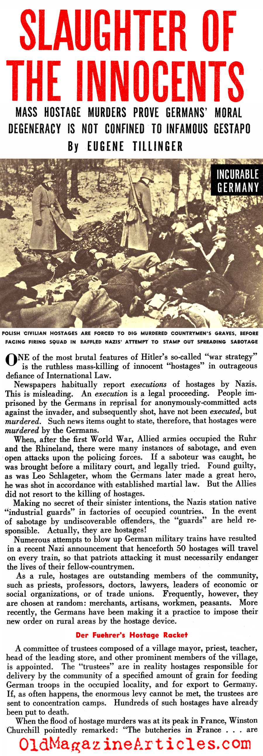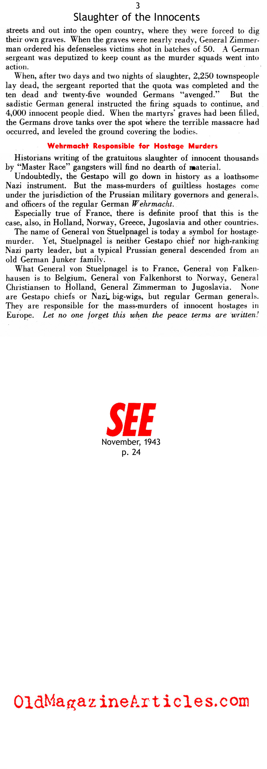 “Historians writing of the gratuitous slaughter of innocent thousands by Master Race gangsters will find no dearth of material. Undoubtedly, the Gestapo will go down as a loathsome Nazi instrument. But the mass-murders of guiltless hostages come under the jurisdiction of the Prussian military governors and generals, and officers of the regular German Wehrmacht. The name of General von Stuelpnagel is today a symbol for hostage -murder. Yet, von Stuelpnagel is neither Gestapo chief or high-ranking Nazi Party leader, but a typical Prussian general descended from an old German Junker family. What von Stuelpnagel is to France, General von Falkenhausen is to Belgium, General von Falkenhorst to Norway, General Christiansen to Holland, General Zimmerman to Yugoslavia… They are responsible for the mass-murders of innocent hostages in Europe. Let no one forget this when the peace terms are written.“