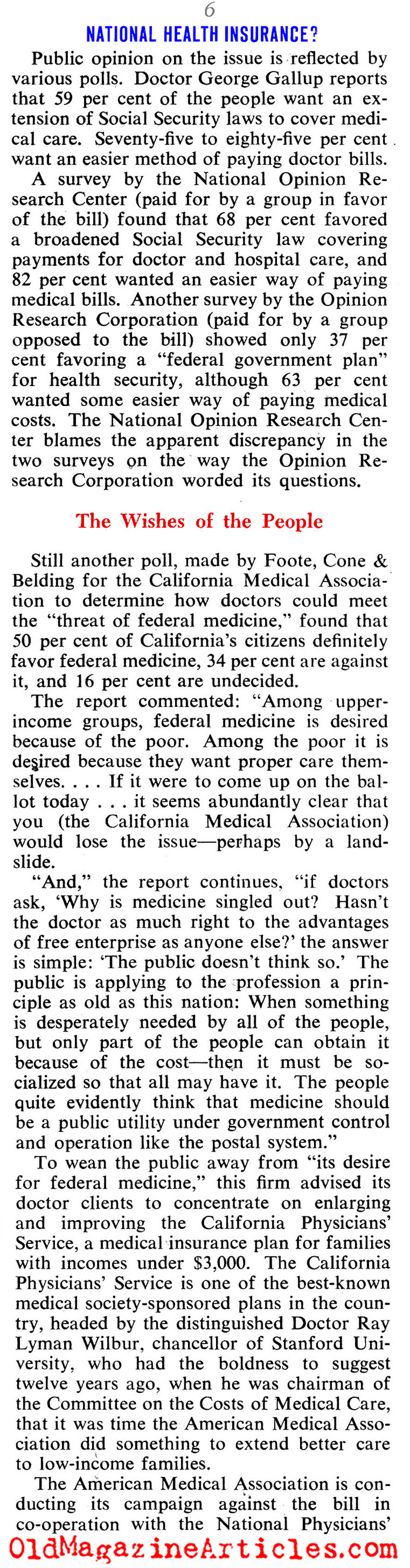 “A survey by the National Opinion Research Center (paid for by a group that is in favor of the bill) found that 68 percent favored a broadened Social Security law covering payment for doctor and hospital care, and 82 percent wanted an easier way of paying medical bills. Another survey by the Opinion Research Corporation (paid for by a group opposed to the bill) showing 37 percent favoring a ‘federal government plan’ for health security, although 63 percent wanted some easier way of paying medical costs.”