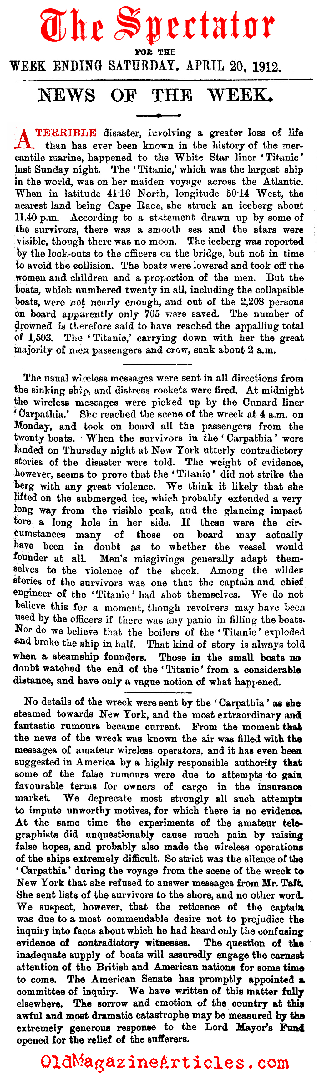 KEY WORDS: Sketchy News Reports on the matter of TITANIC sinking 1912,Vague News Reports on the issue of TITANIC sinking 1912,Titanic Reports printed in SPECTATOR MAGAZINE 1912,portions of Titanic Eyewitnesses accounts rejected by SPECTATOR editors,
