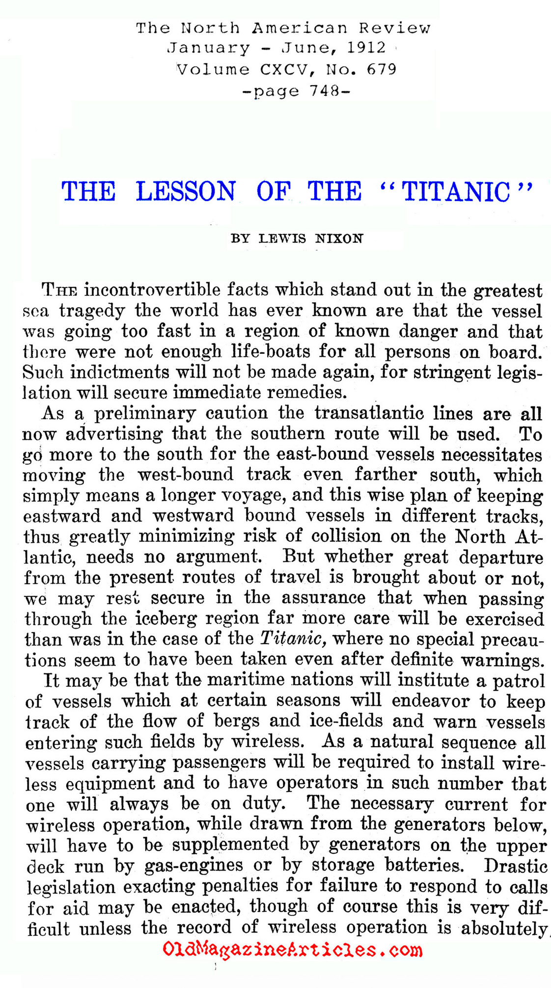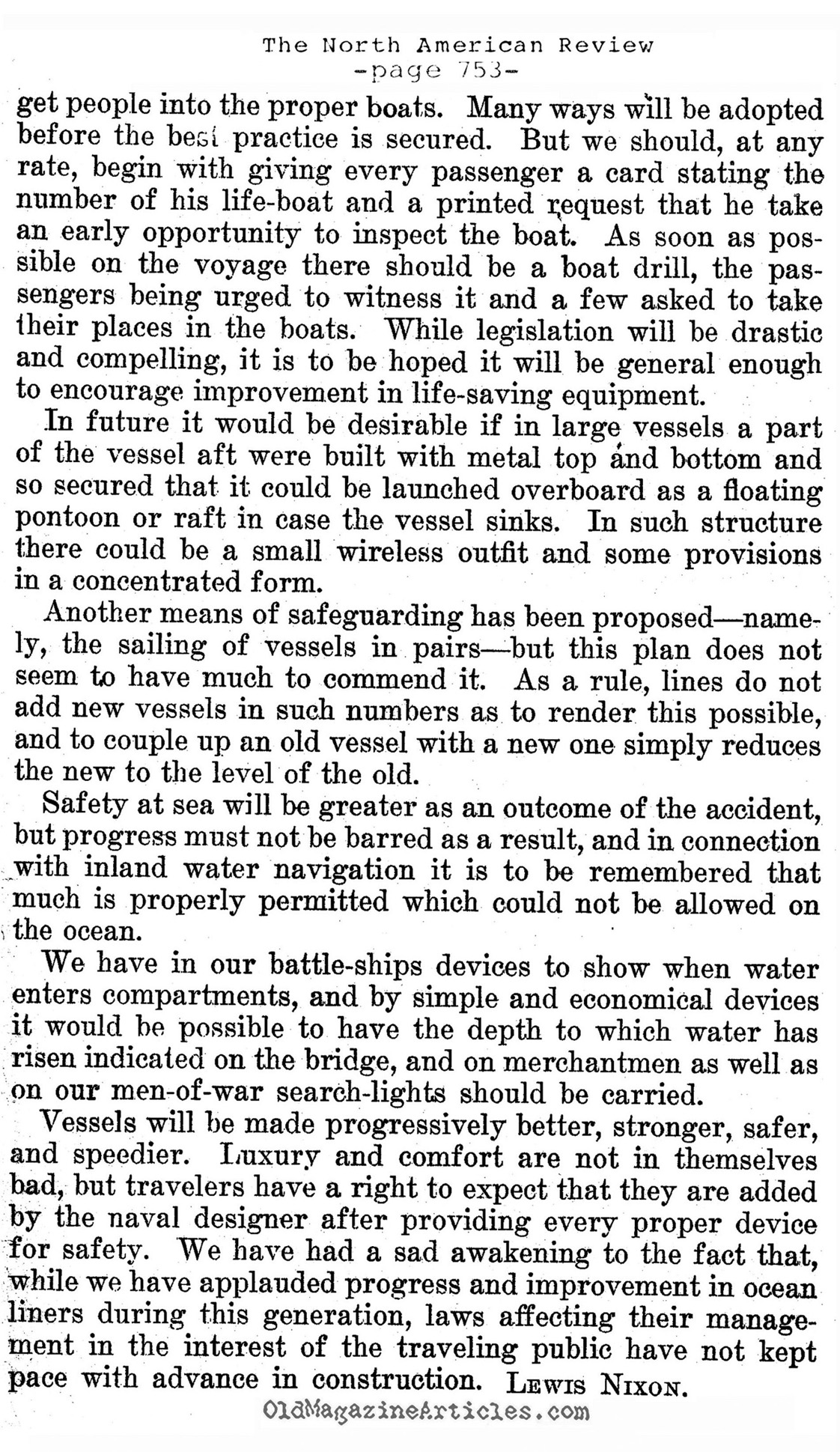 Lewis Nixon (1861 – 1940), a naval architect of battleships and a popular New York politician, maintained throughout this entire article that the full array of 1912 technology was ignored in the planning of Titanic‘s first (and last) voyage: