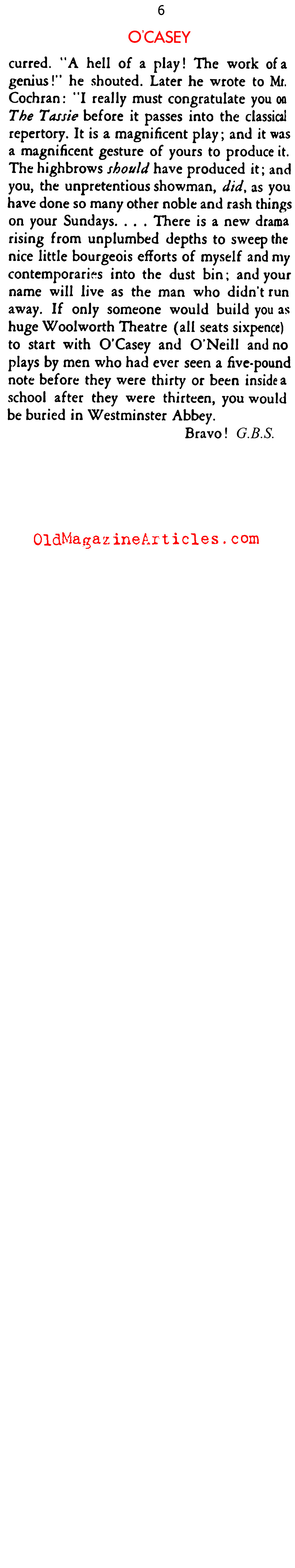 KEY WORDS: Sean O’Casey newspaper article,Sean O’Casey bio,playwright Sean O’Casey magazine article,Sean O’Casey Interviewed by Ruth Woodbury Sedgwick 1934,Sean O’Casey Interviewed in STAGE MAGAZINE 1934