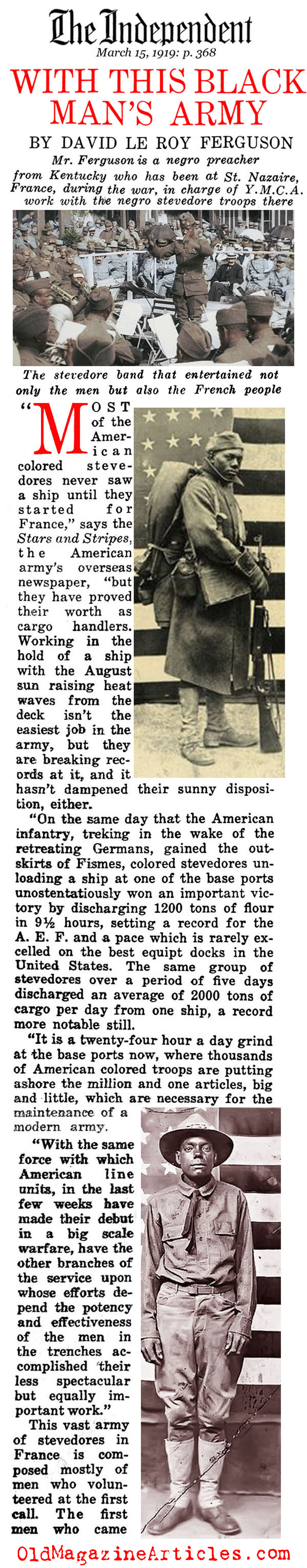 This W.W. I article was written by David Le Roy Ferguson, an African-American pastor assigned to minister to a flock of black Doughboys posted to the supply depot at St. Nazaire, France. These men were stevedores who were ordered to perform the thankless task of off-loading cargo from the various supply ships arriving daily to support the A.E.F.. Aside from working as cooks or in other service positions, this was a customary assignment given to the African-Americans during the war; only a small percentage were posted to the 92nd and 93rd combat divisions.