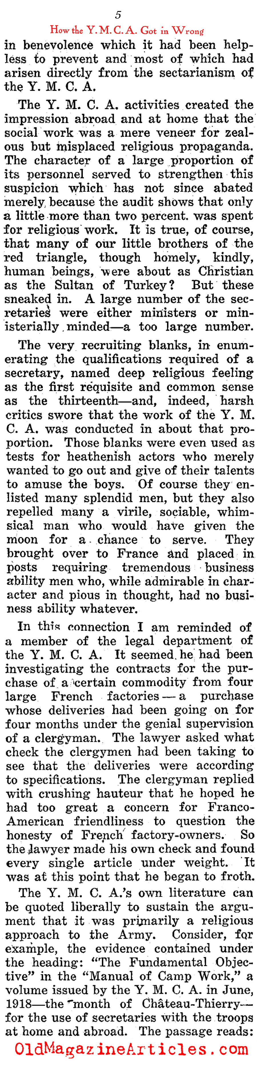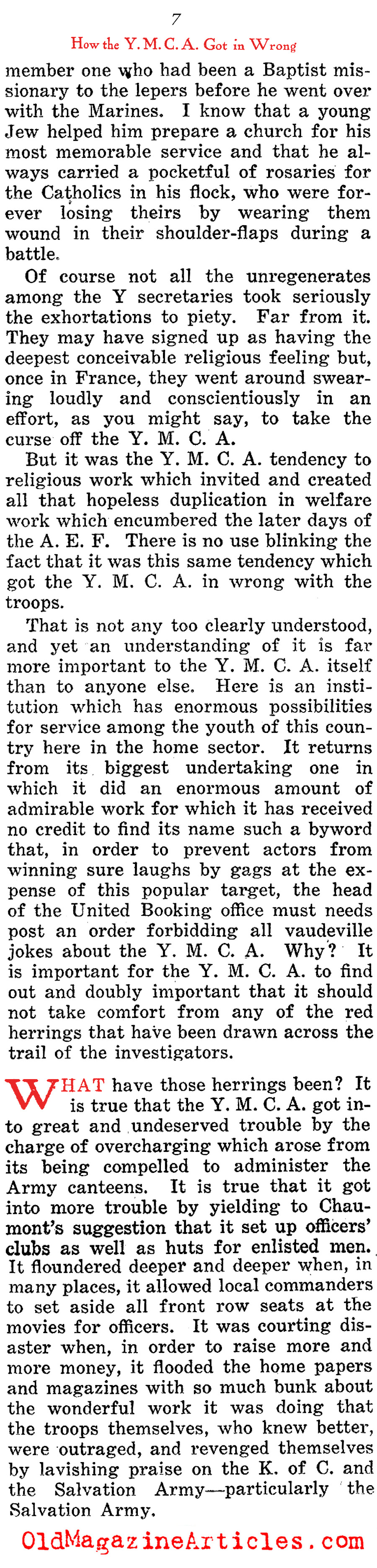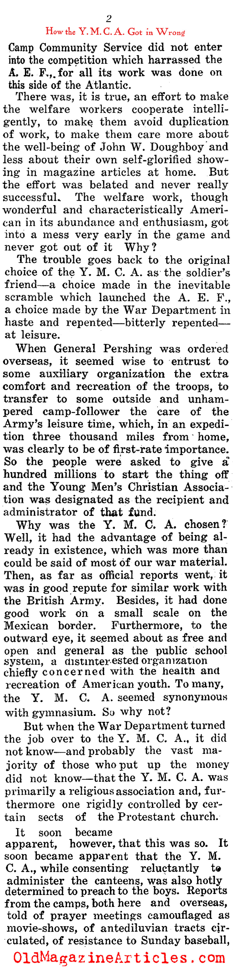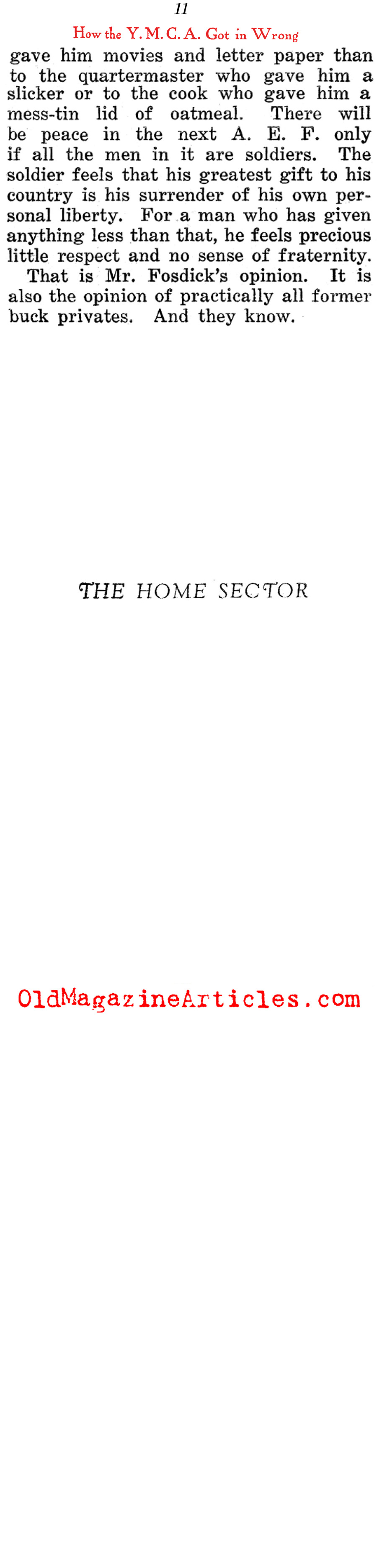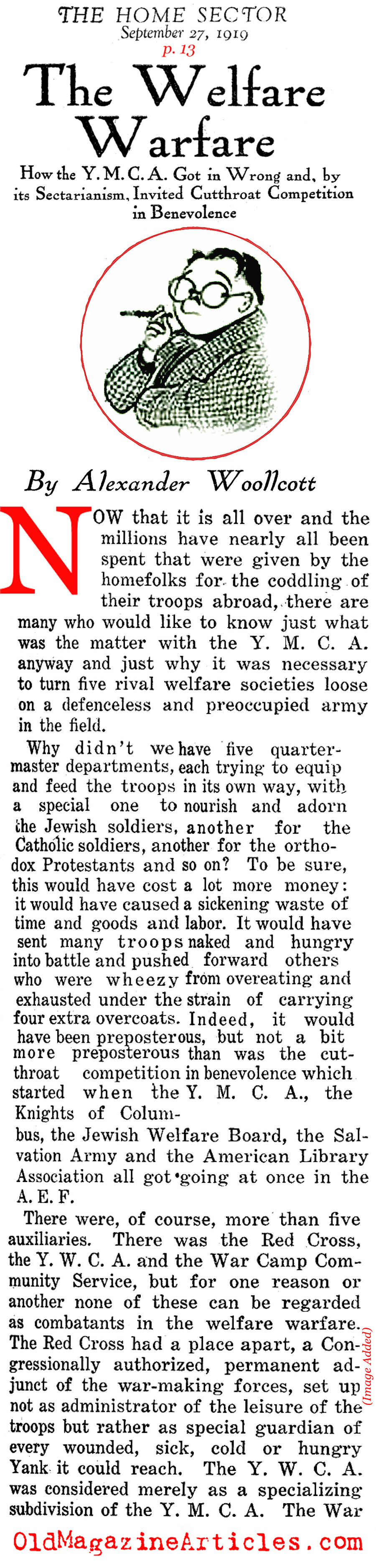 Shortly after the Doughboy journalist Alexander Woollcott (1887 – 1943) had been demobilized and repatriated, he wrote this highly involved column in which he defamed the American benevolent organization, the Y.M.C.A. (Young Men’s Christian Association) for the part they played as a relief organization during the war. There were many such groups that were sent abroad to cheer up American military personnel – the Jewish Welfare Board, the Knights of Columbus, the Salvation Army and the War Camp Community Service – to name just a few, but the YMCA was the only one among them Woollcott believed to have been deserving of a Doughboy’s ire.