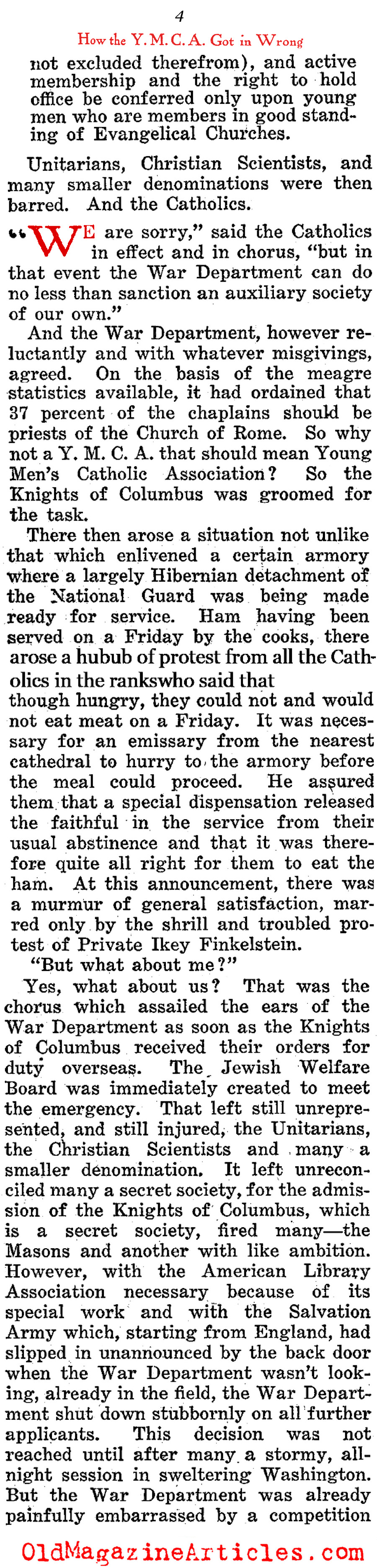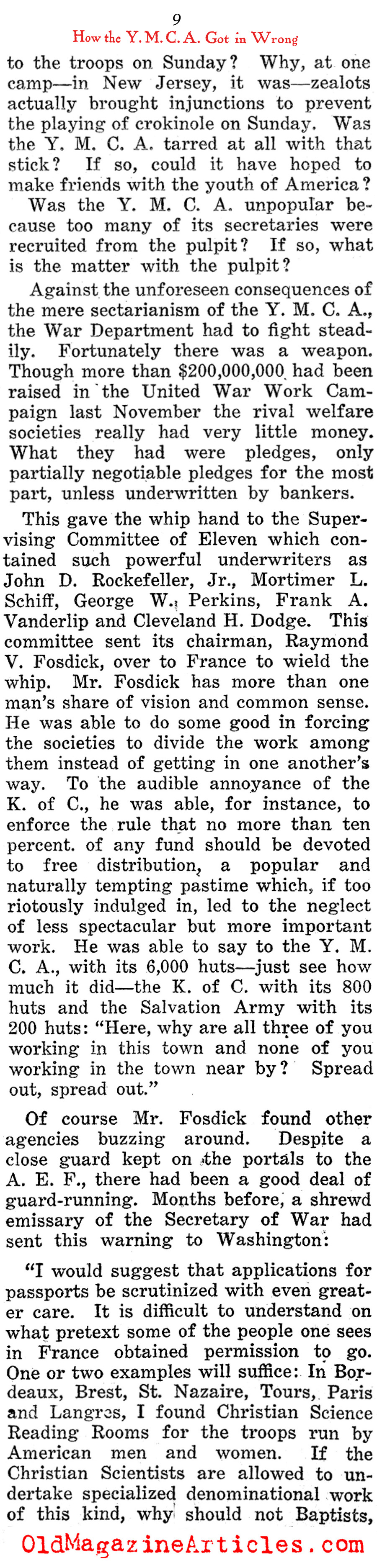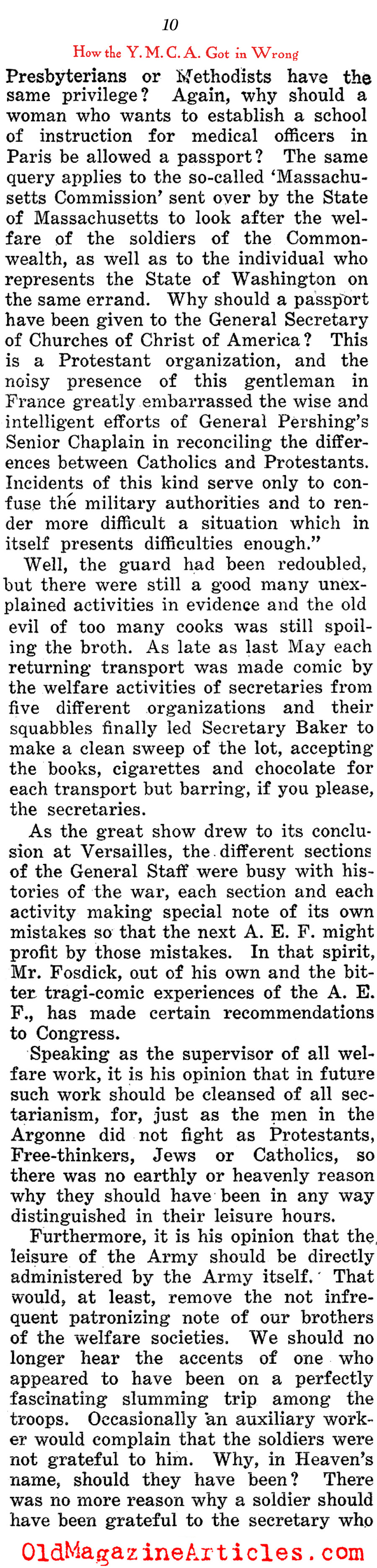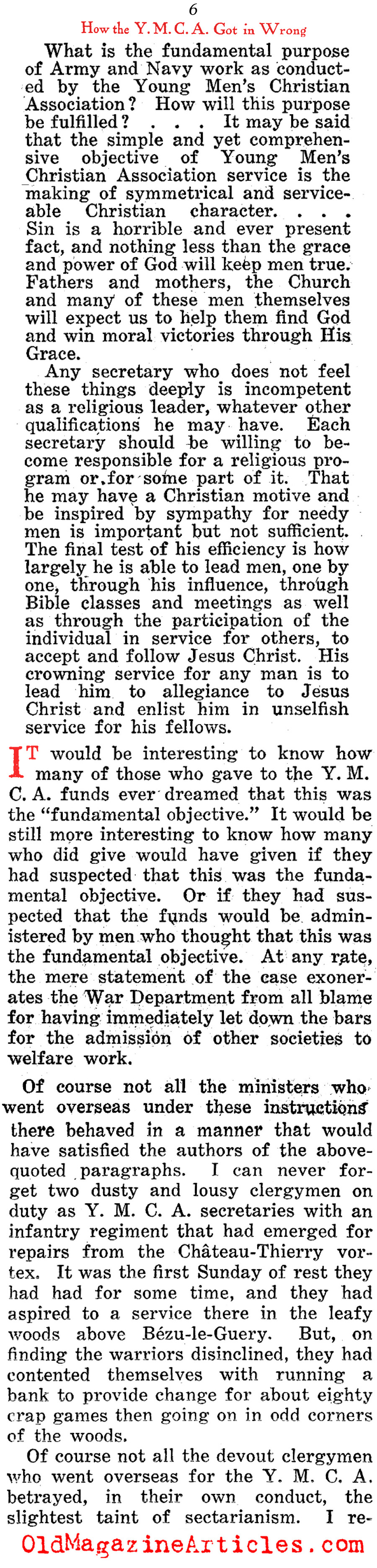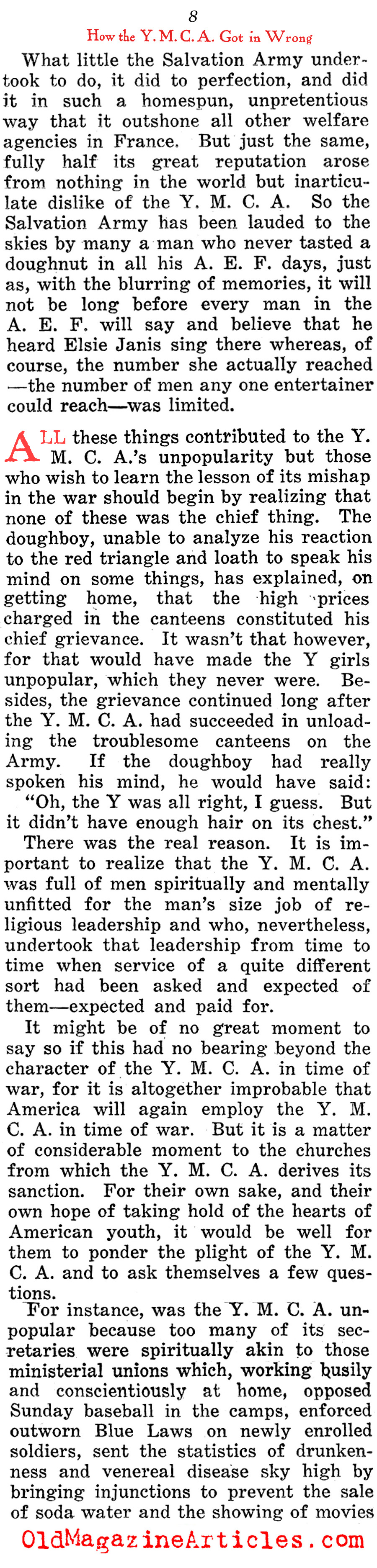 Shortly after the Doughboy journalist Alexander Woollcott (1887 – 1943) had been demobilized and repatriated, he wrote this highly involved column in which he defamed the American benevolent organization, the Y.M.C.A. (Young Men’s Christian Association) for the part they played as a relief organization during the war. There were many such groups that were sent abroad to cheer up American military personnel – the Jewish Welfare Board, the Knights of Columbus, the Salvation Army and the War Camp Community Service – to name just a few, but the YMCA was the only one among them Woollcott believed to have been deserving of a Doughboy’s ire.