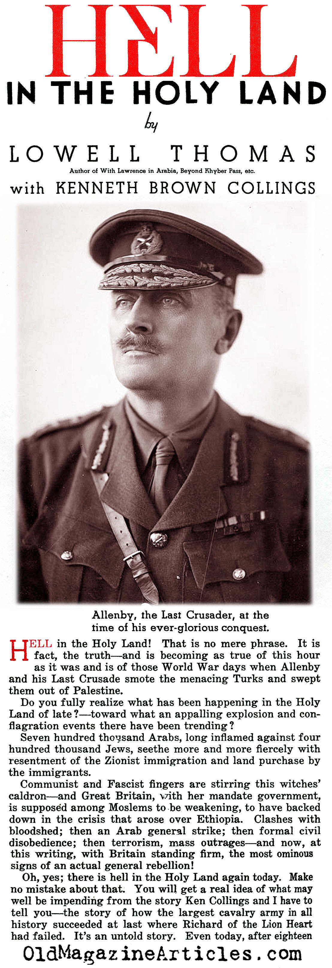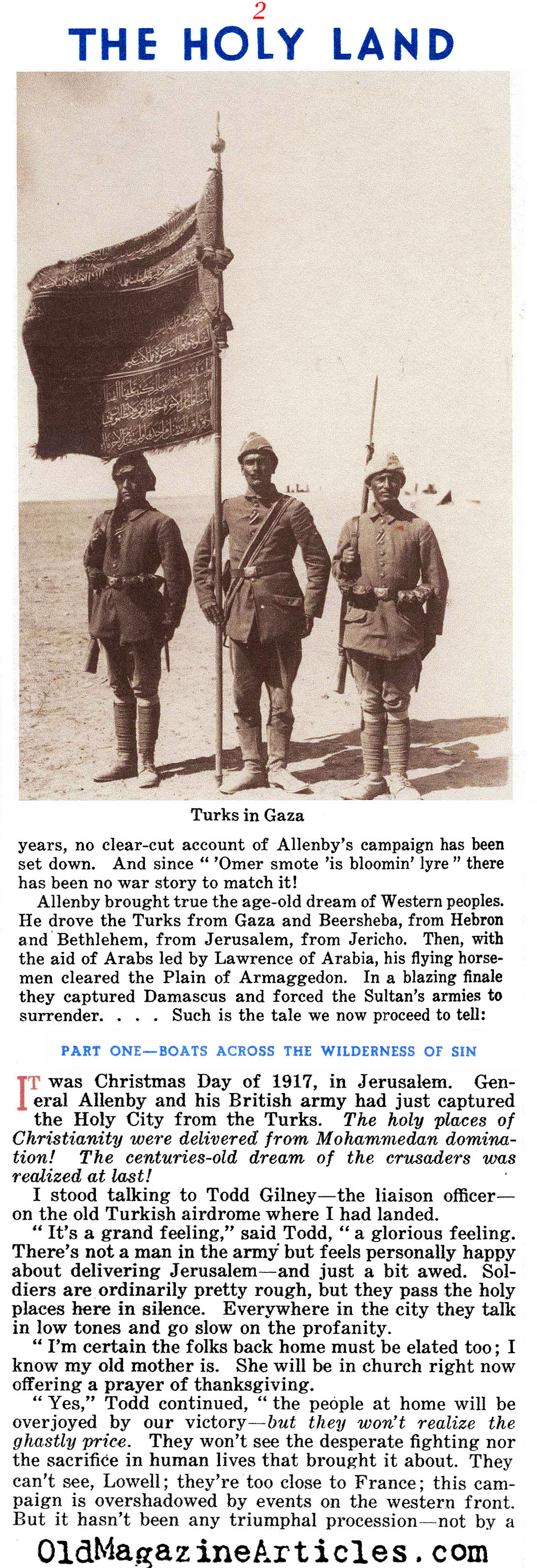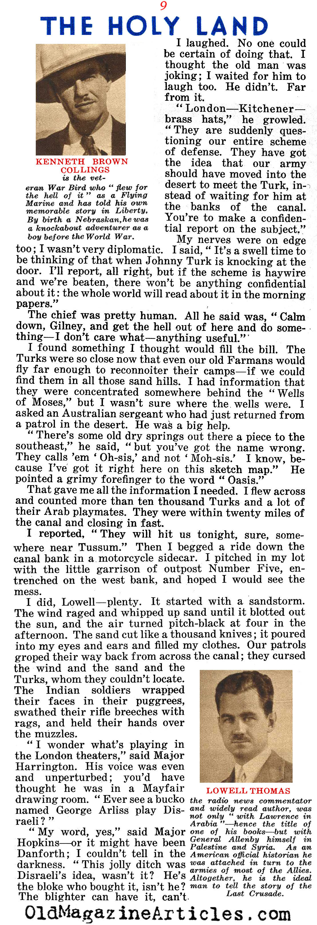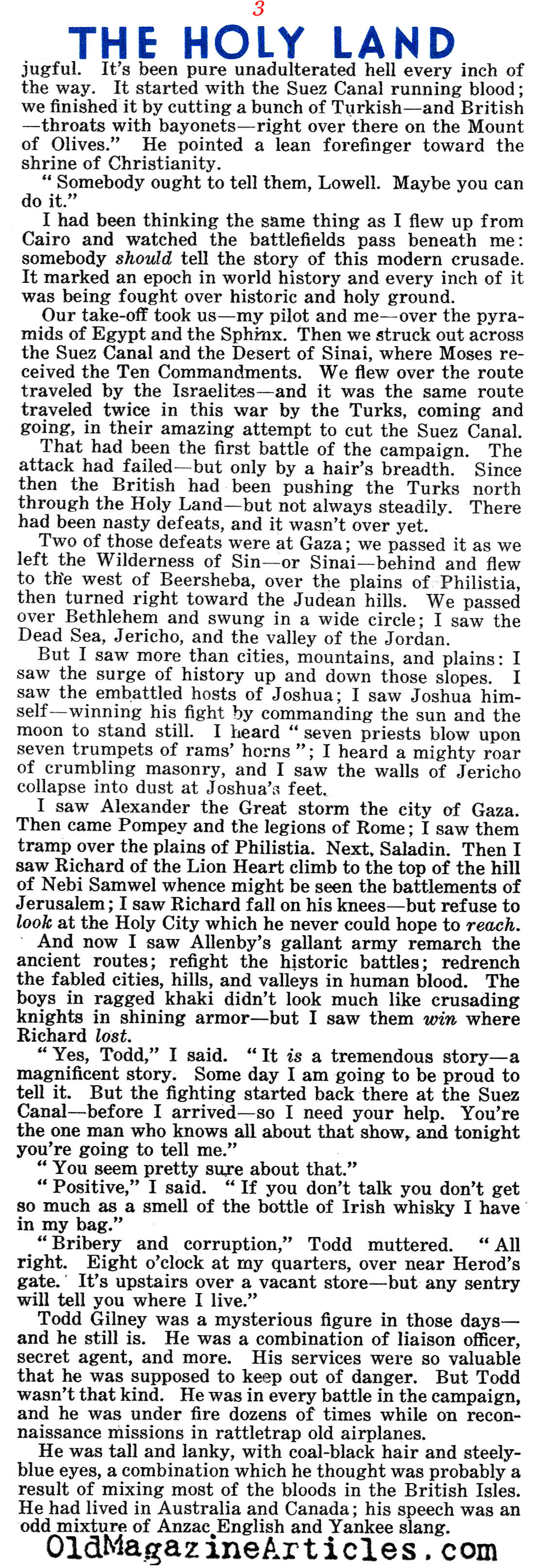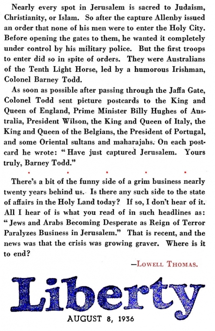 On the right is an article by American journalist Lowell Thomas (1892 – 1981) regarding all that he witnessed while reporting on General Edmund Allenby’s campaign against Johnny Turk in the Sinai and Palestine Theater during the First World War. This reminiscence was written many years after the war in an effort to make up for the fact that “after eighteen years, no clear-cut account of Allenby’s campaign has been set down”: