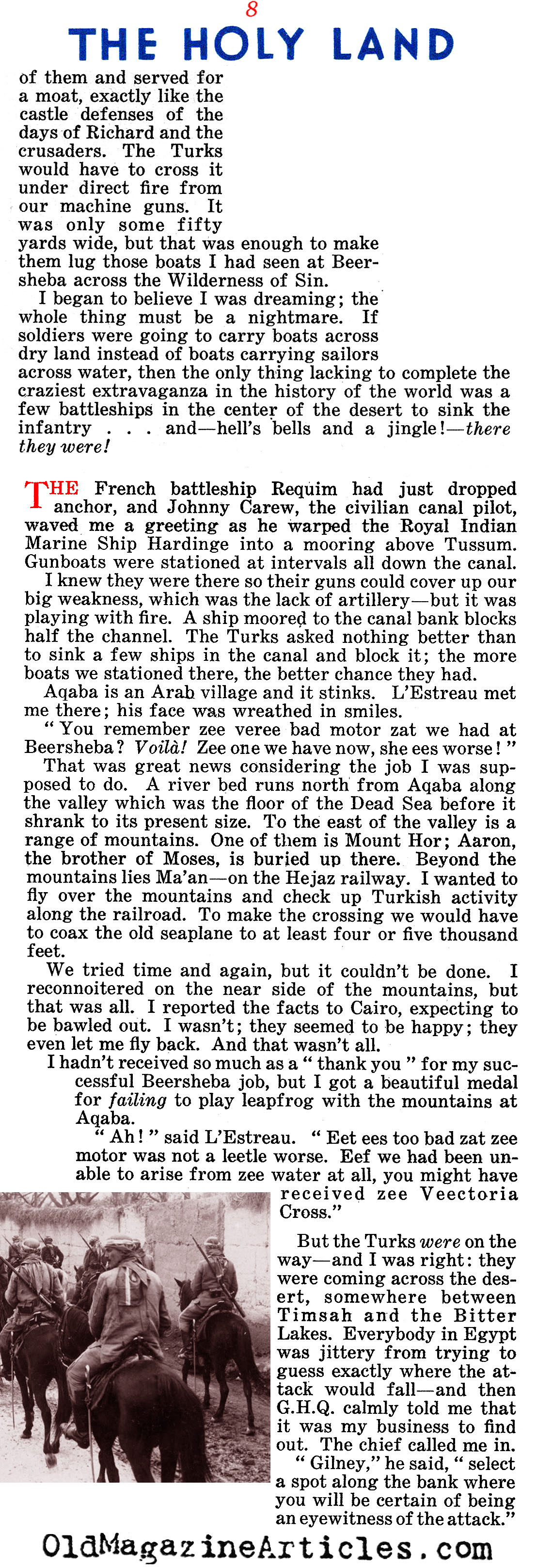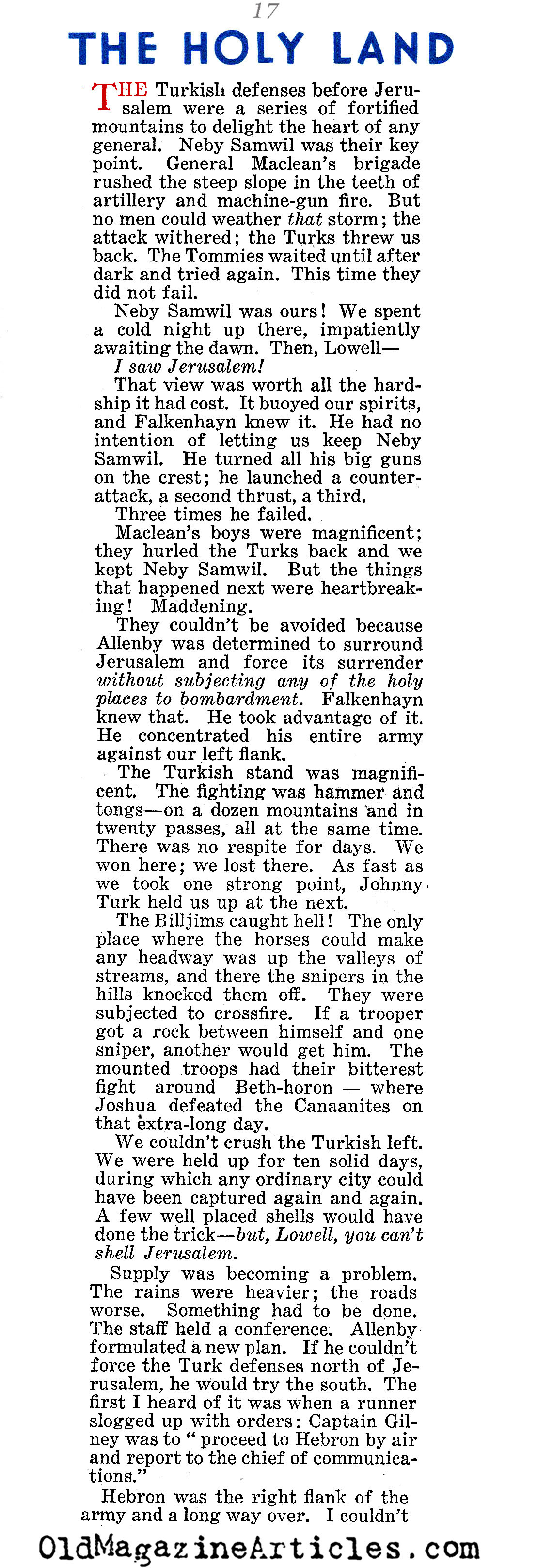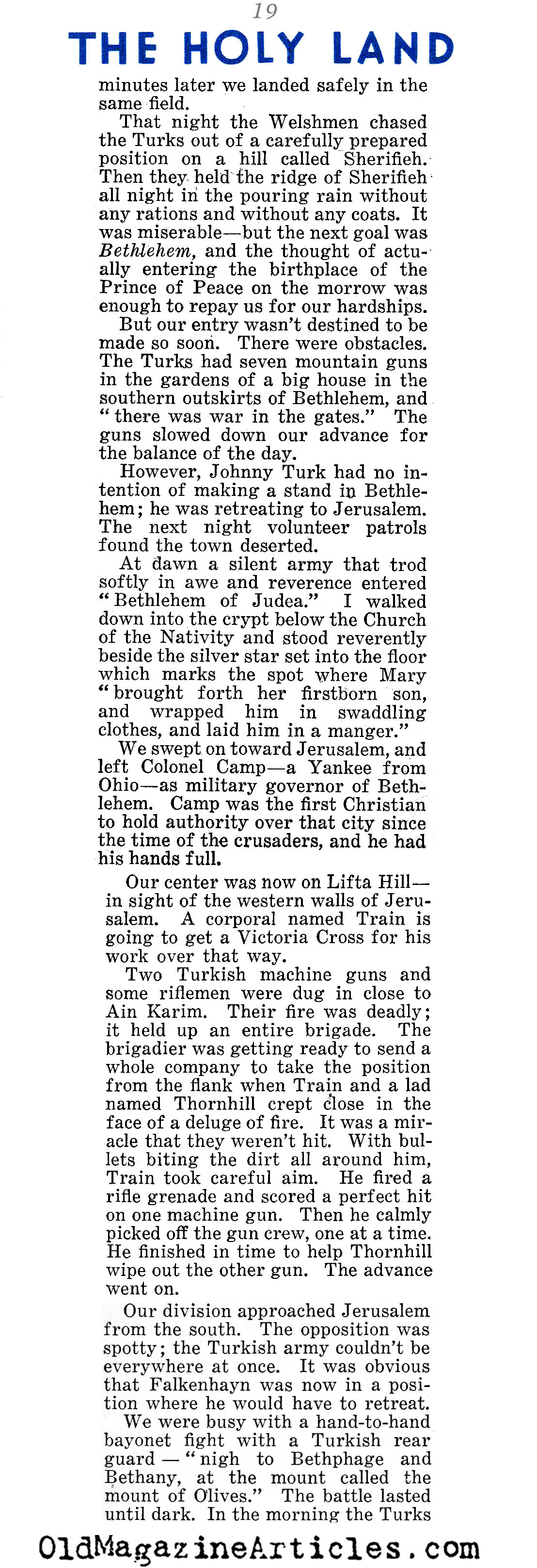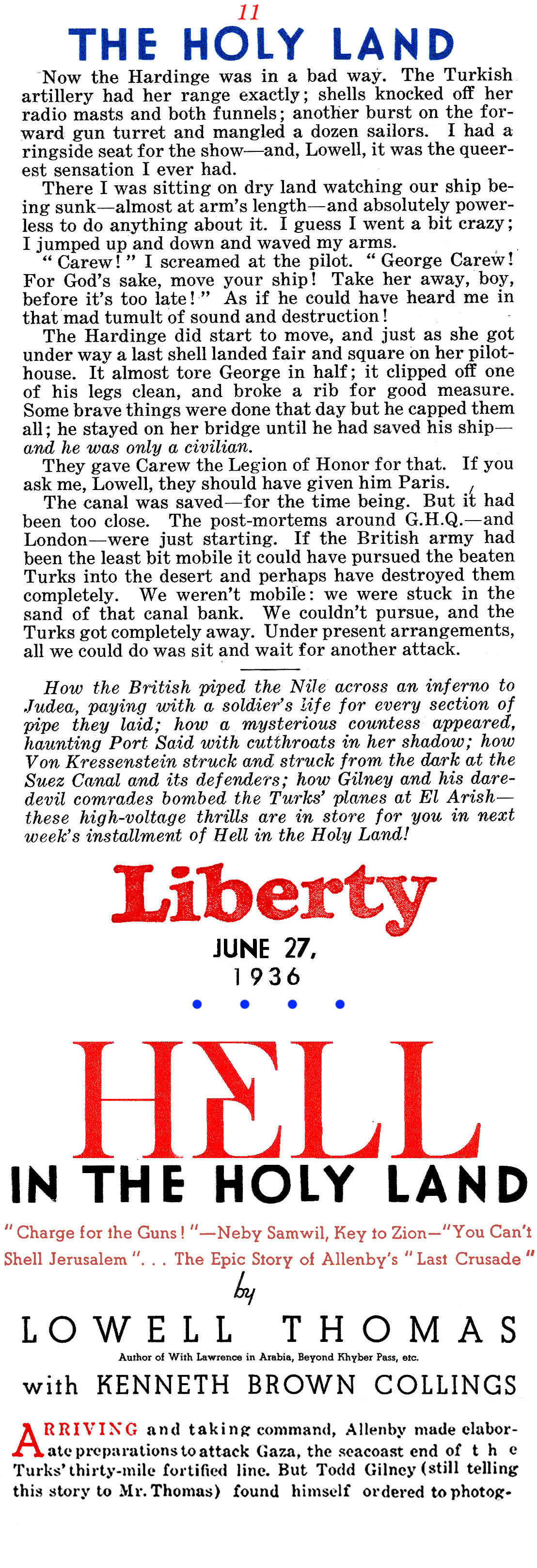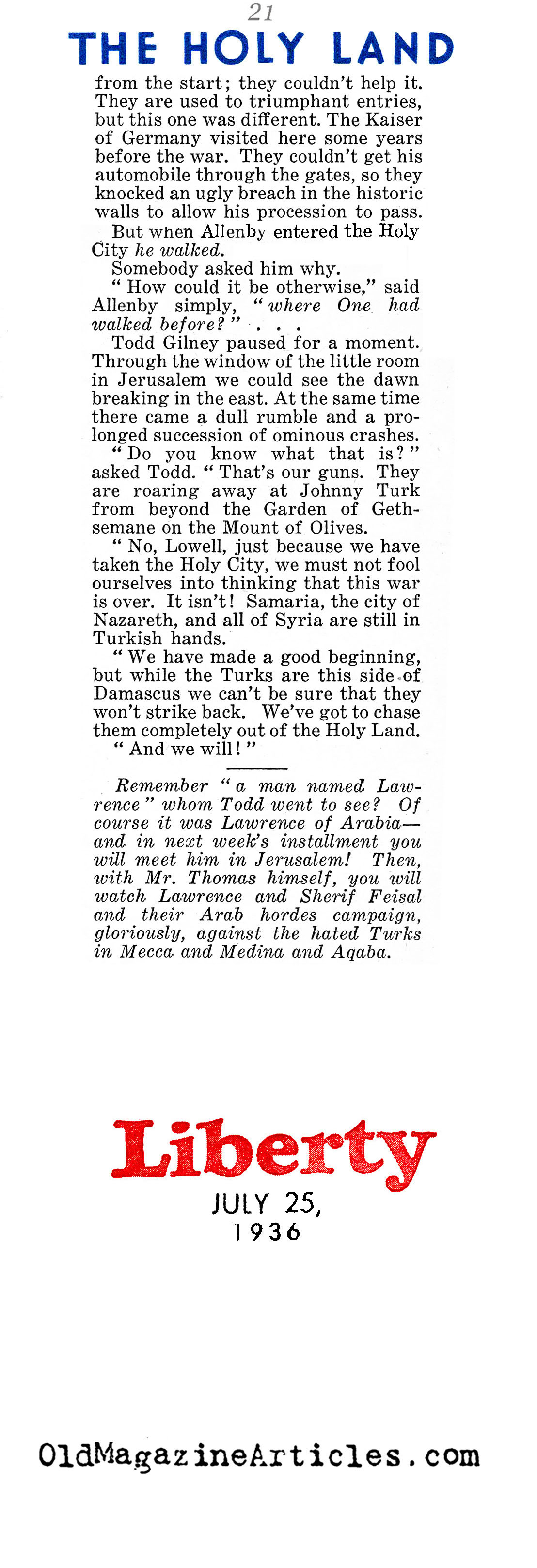 On the right is an article by American journalist Lowell Thomas (1892 – 1981) regarding all that he witnessed while reporting on General Edmund Allenby’s campaign against Johnny Turk in the Sinai and Palestine Theater during the First World War. This reminiscence was written many years after the war in an effort to make up for the fact that “after eighteen years, no clear-cut account of Allenby’s campaign has been set down”:
