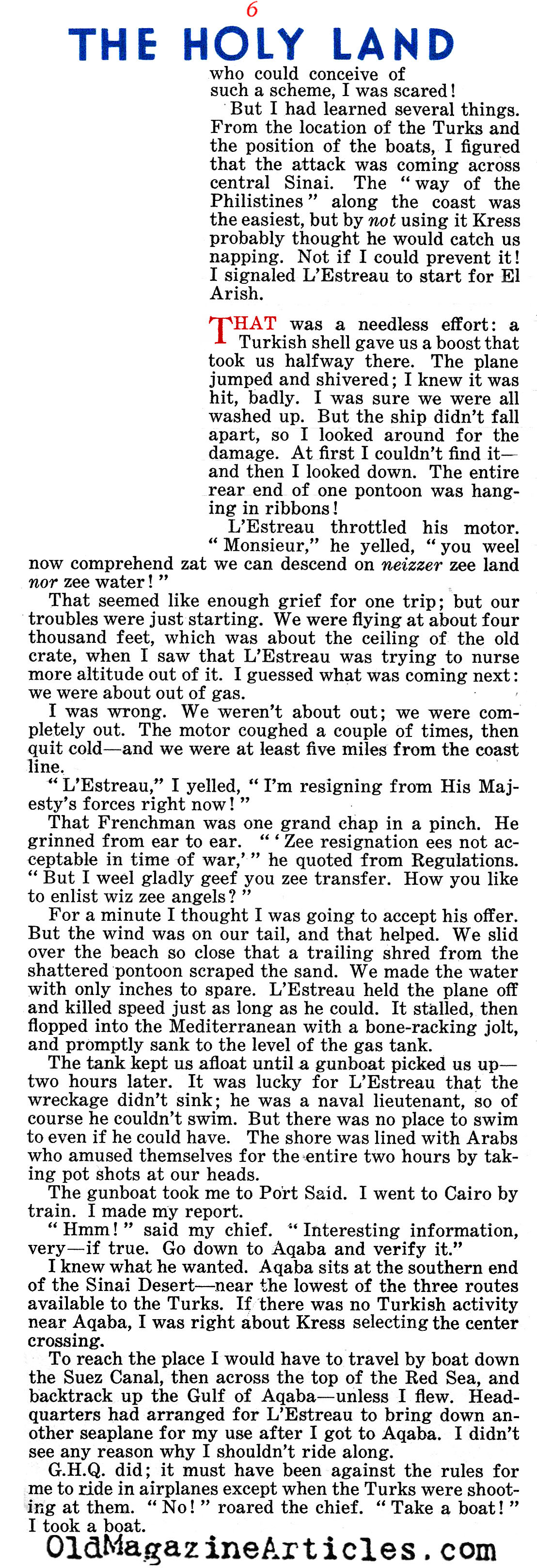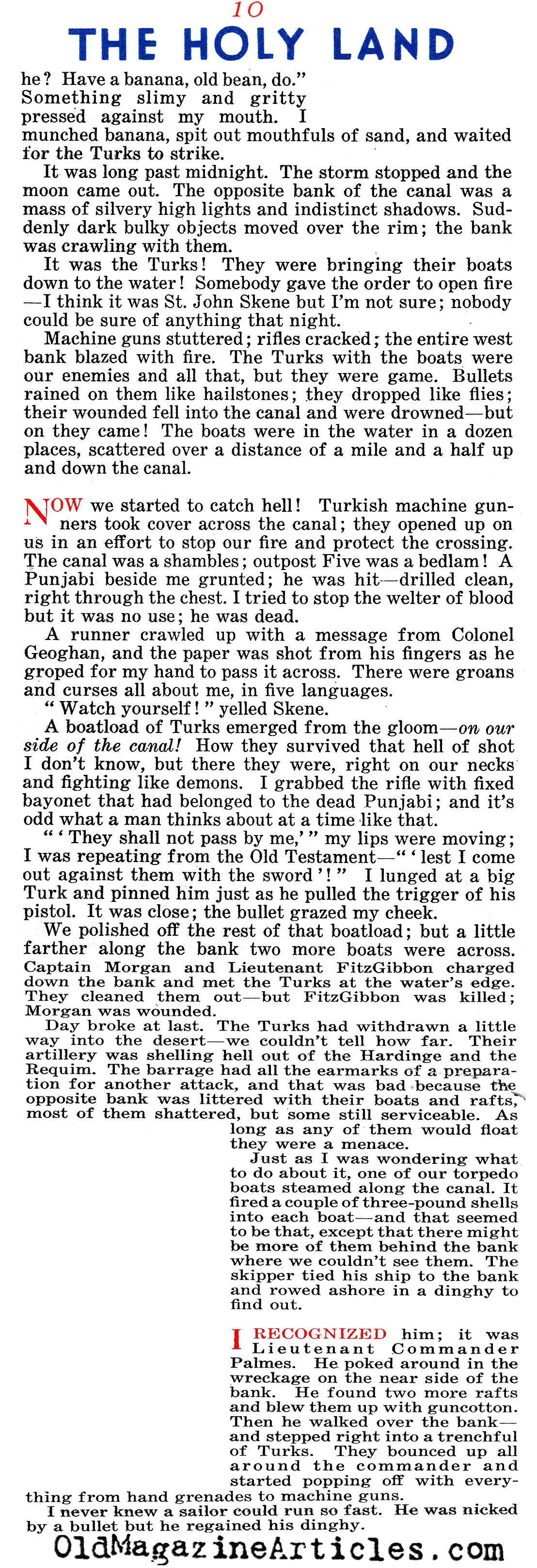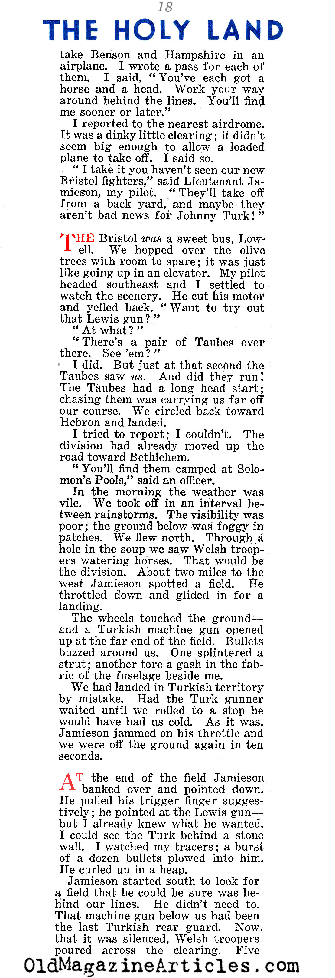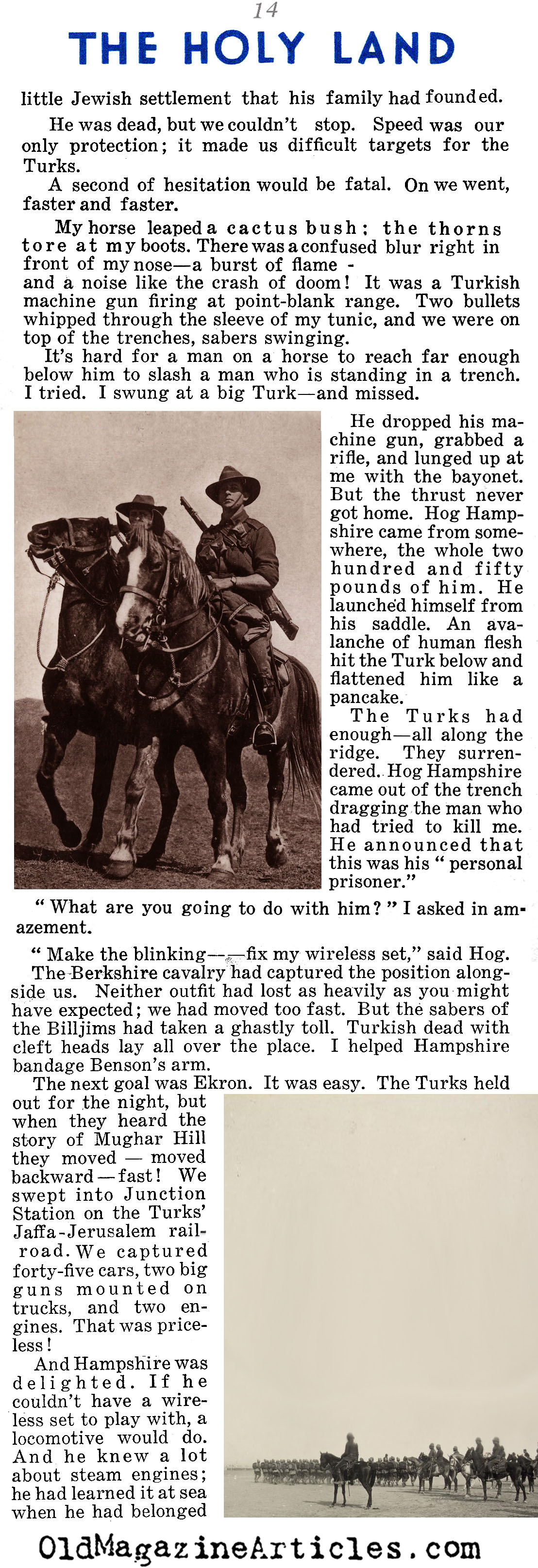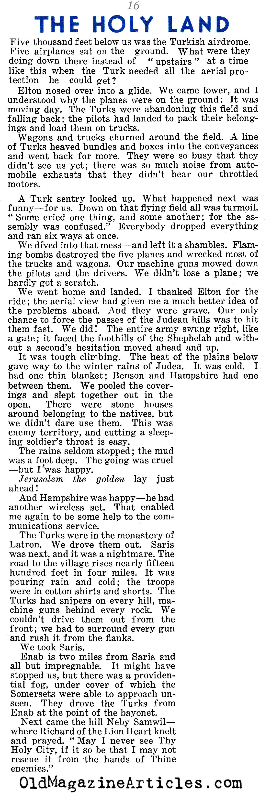 On the right is an article by American journalist Lowell Thomas (1892 – 1981) regarding all that he witnessed while reporting on General Edmund Allenby’s campaign against Johnny Turk in the Sinai and Palestine Theater during the First World War. This reminiscence was written many years after the war in an effort to make up for the fact that “after eighteen years, no clear-cut account of Allenby’s campaign has been set down”: