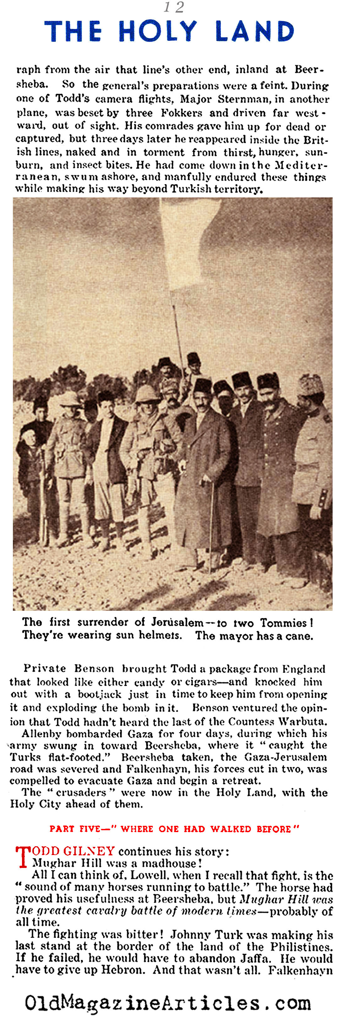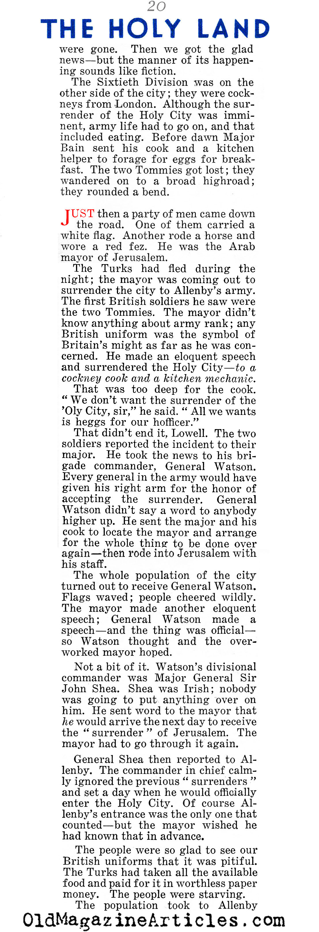 “The Turks had fled during the night; the mayor of was coming out to surrender the city to Allenby’s army. The first British soldiers he saw were these two Tommies. The mayor didn’t know anything about army rank; any British uniform was the symbol of Britain’s might as far as he was concerned. He made an eloquent speech and surrendered the Holy City – to a cockney cook and a kitchen mechanic.”
