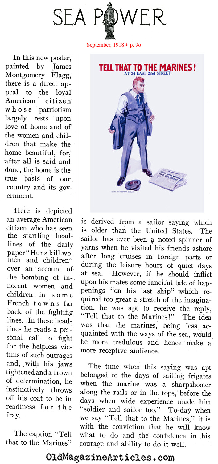 The attached single page article explains the origins and development of the famed Tell That To The Marines poster that was created by James Montgomery Flagg in 1918.
