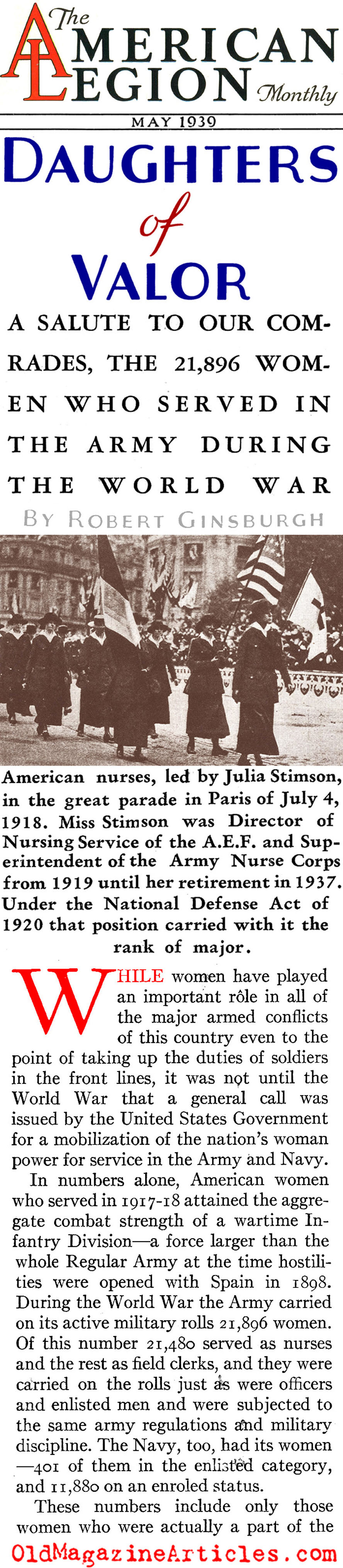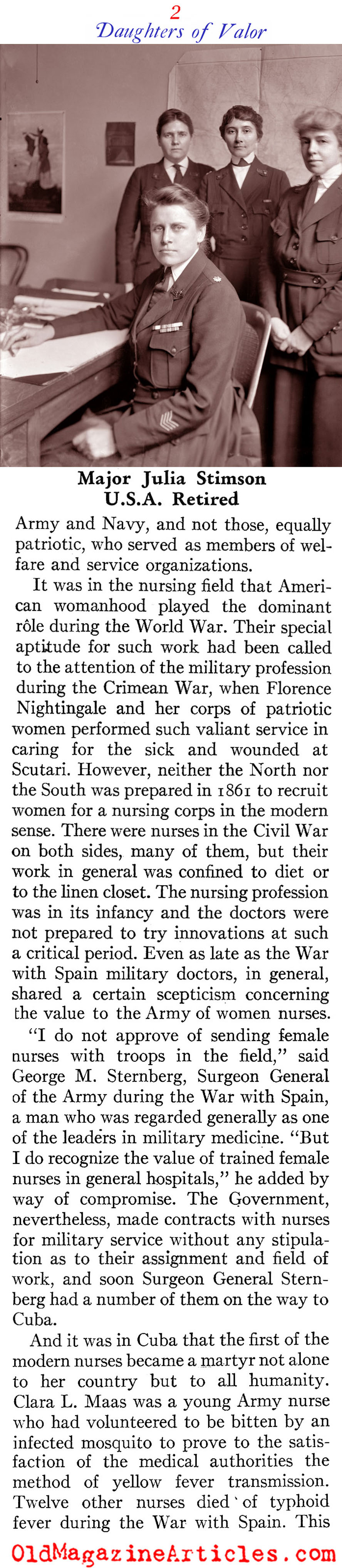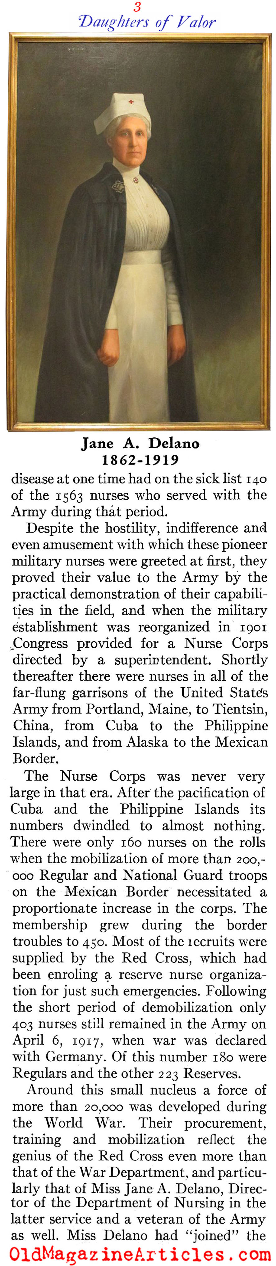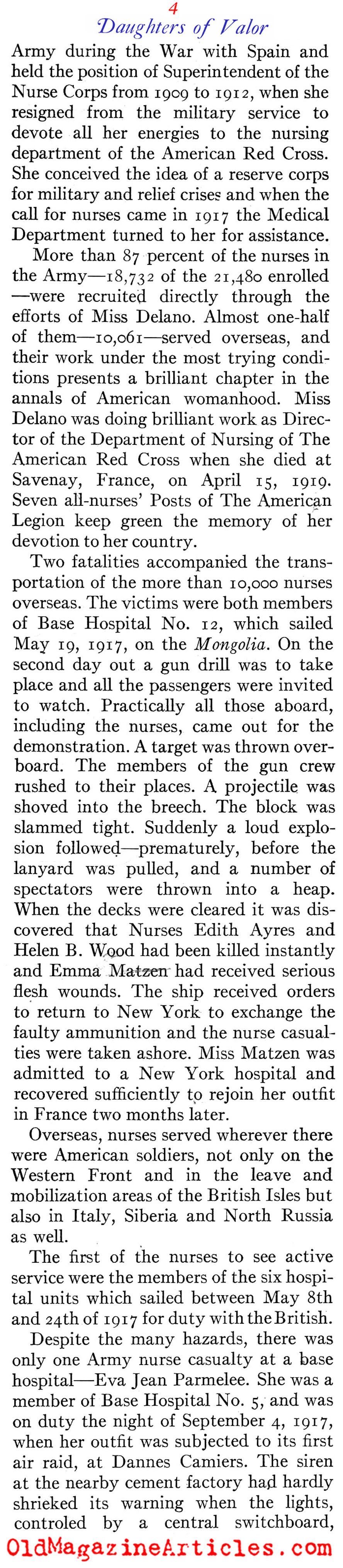 Attached is an interesting history of the U.S. Army Nurse Corps during the First World War. The author, Robert Ginsburgh, delves into how many nurses were killed, how the nurses were recruited, where they served throughout Europe, their training and the decorations earned.