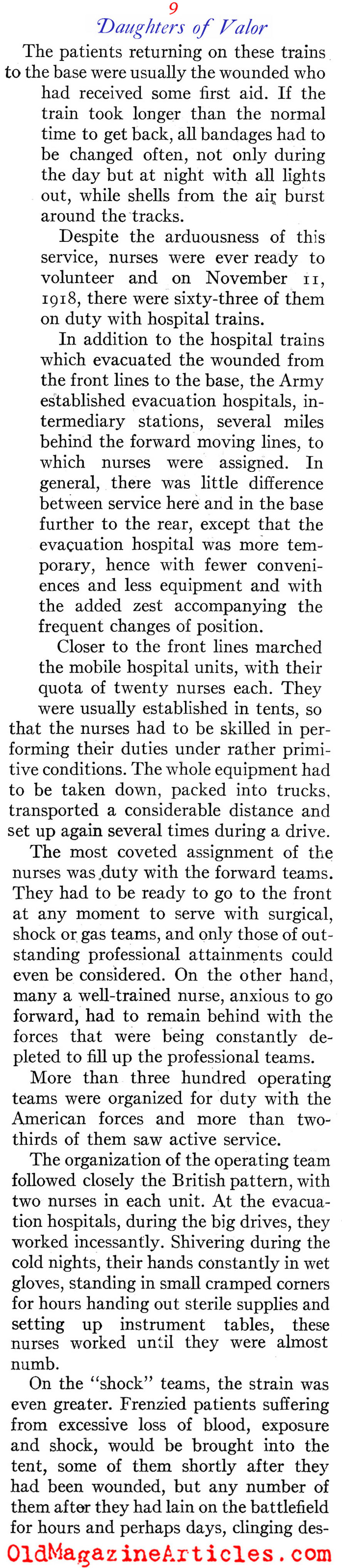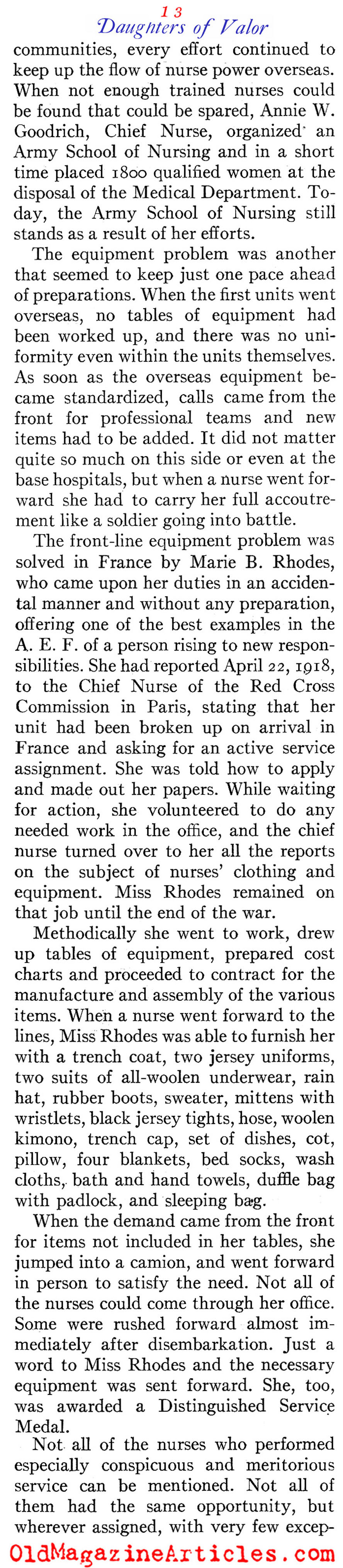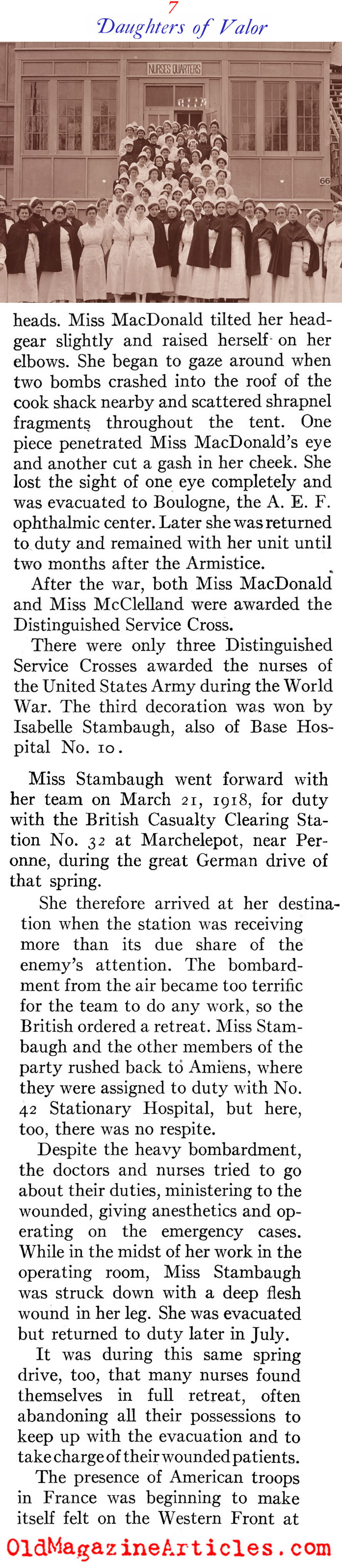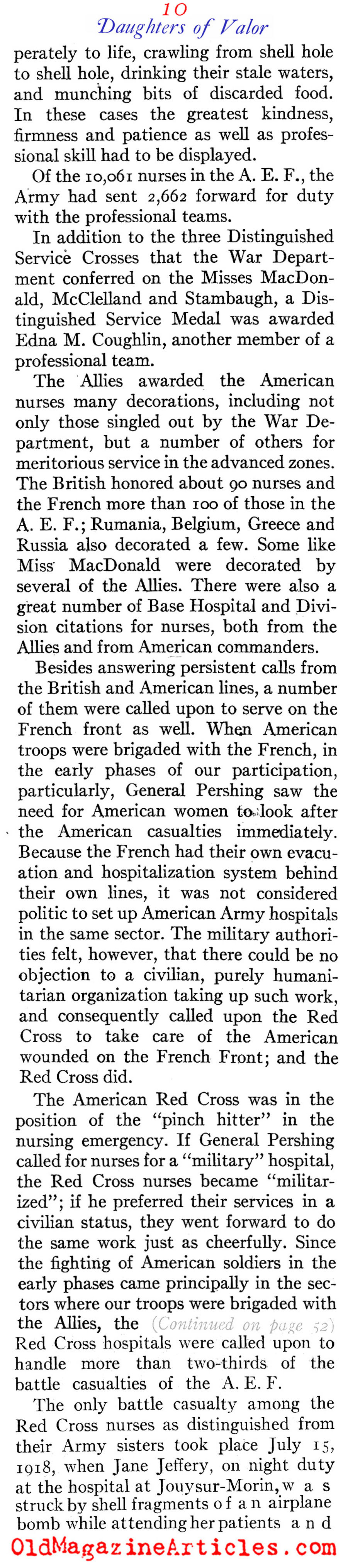 “The most coveted assignment of the nurses was duty with the forward teams. They had to be ready to go to the front at any moment to serve with surgical, shock or gas teams, and only those of outstanding professional attainments could even be considered… The Allies awarded the American nurses many decorations, including not only those singled out by the War Department, but a number of others for meritorious service in the advanced zones. The British honored about 90 nurses and the French more than 100 in the AEF; Rumania, Belgium, Greece, and Russia also decorated a few.”