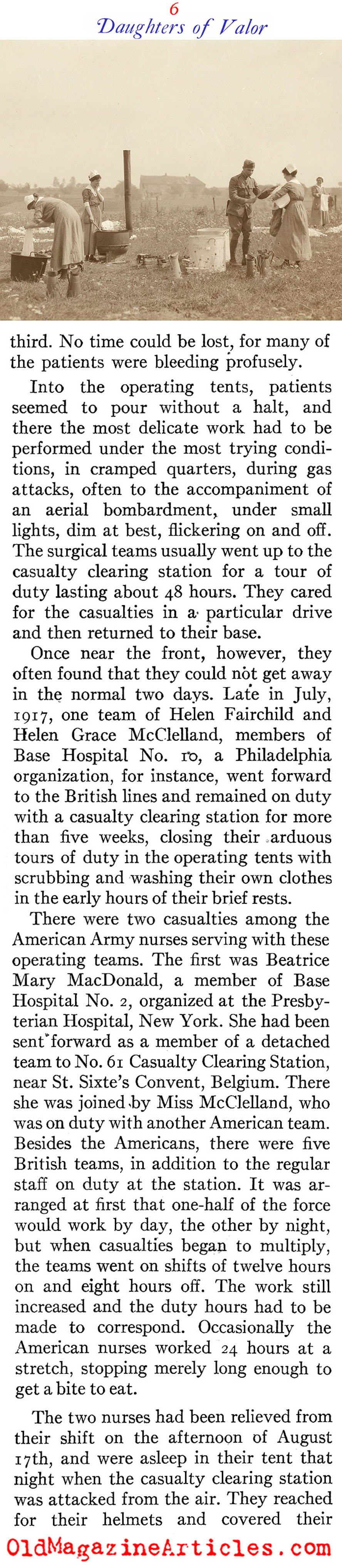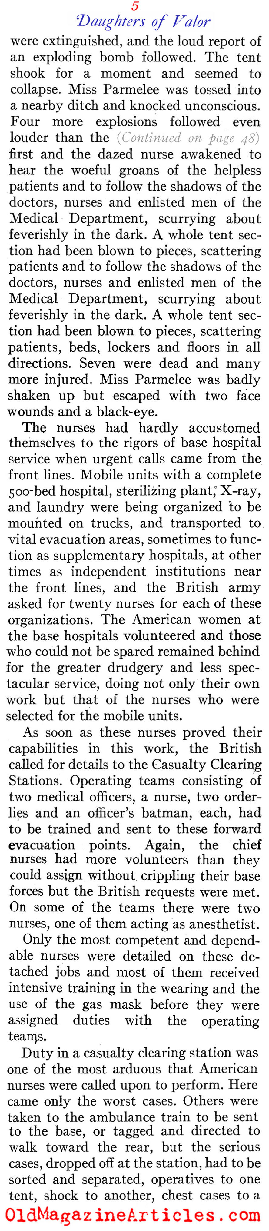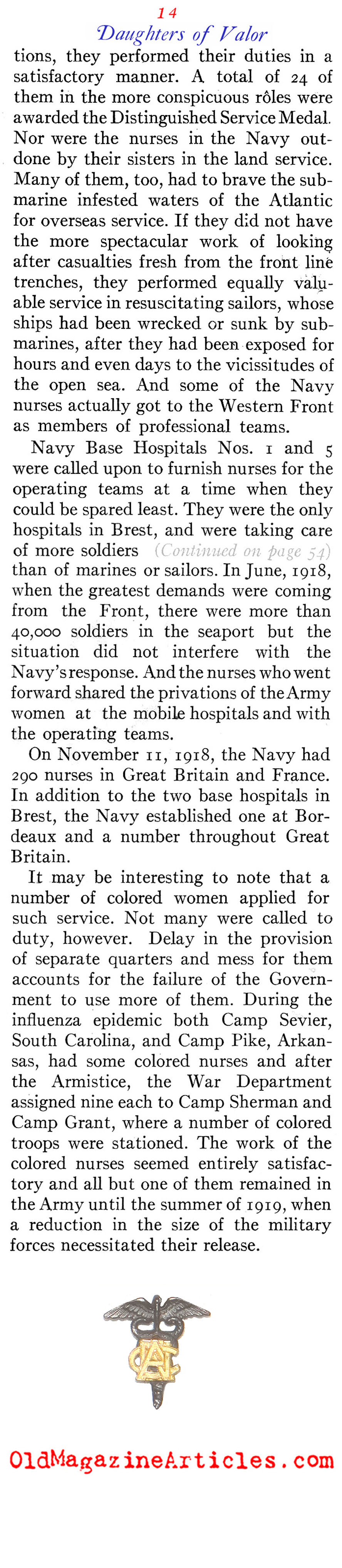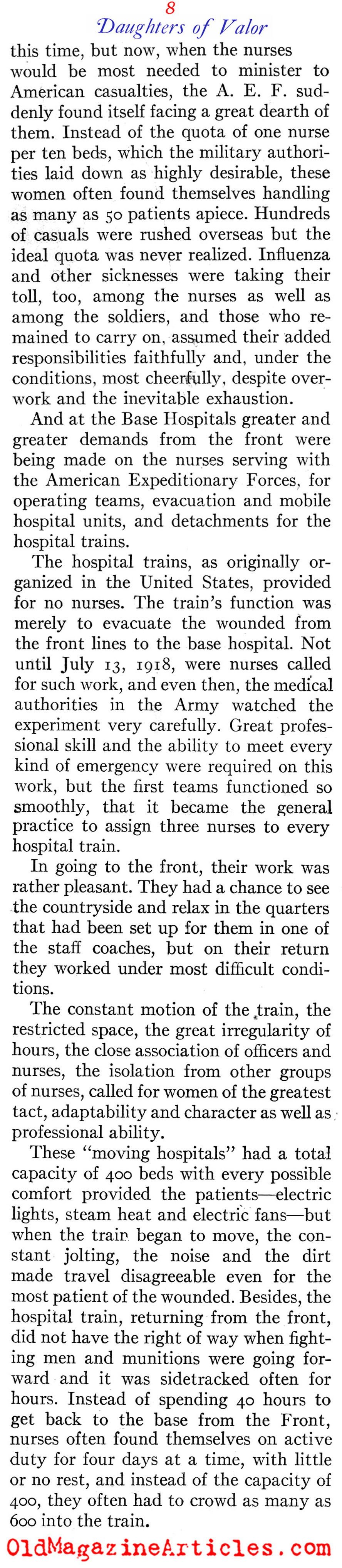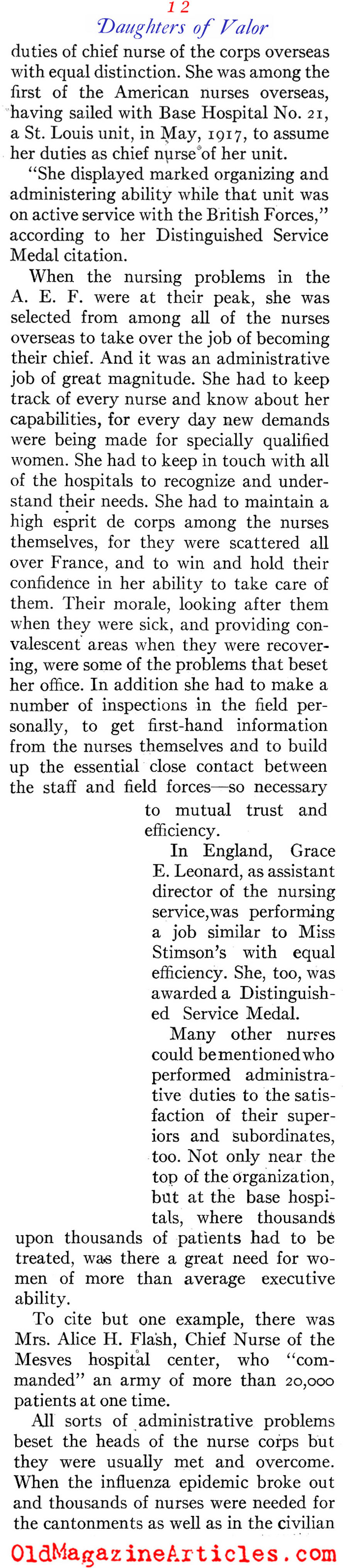 “The most coveted assignment of the nurses was duty with the forward teams. They had to be ready to go to the front at any moment to serve with surgical, shock or gas teams, and only those of outstanding professional attainments could even be considered… The Allies awarded the American nurses many decorations, including not only those singled out by the War Department, but a number of others for meritorious service in the advanced zones. The British honored about 90 nurses and the French more than 100 in the AEF; Rumania, Belgium, Greece, and Russia also decorated a few.”