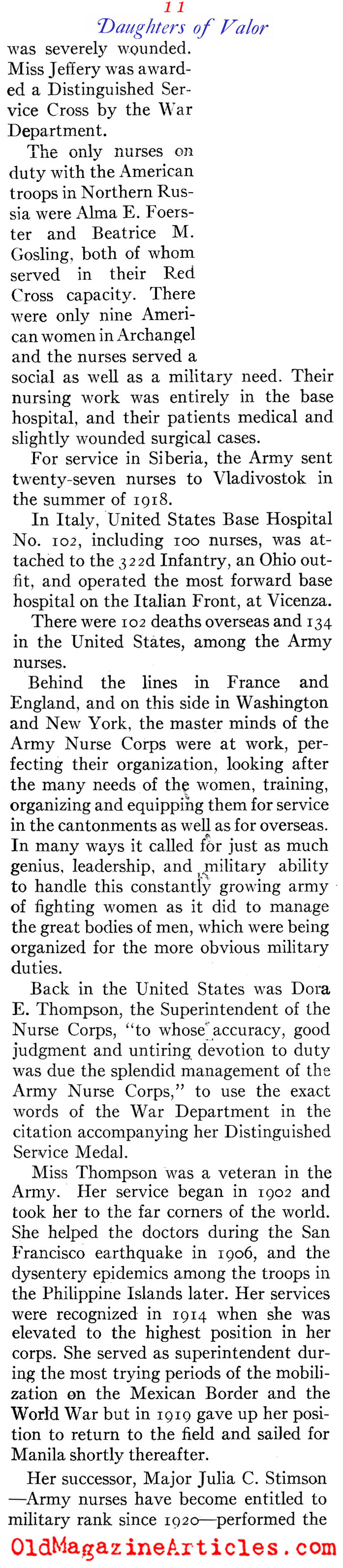 KEY WORDS: Major Julia Stimson Director of Nursing Service AEF 1917 – 1919,Major Julia Stimson Distinguished Service Cross medal WW1,Jane Delano Nursing Service AEF 1917 – 1919,camp Sevier South Carolina during WW1,Camp Pike Arkansas African-American Nurses AEF 1917-1919,Camp Sherman African-American Nurses AEF 1917-1919,Camp Grant African-American Nurses AEF 1917-1919,Marie B Rhodes AEF Nurses in France 1917-1919,Annie W Goodrich Chief Nurse US Army School of Nursing,Grace E Leonard Assistant Director of Nursing Service in WW1 England,WW I women who were awarded the Distinguished Service Cross medal 1918 – 1919,Alice H Flash Chief of Nursing at the Mesves Hospital 1918,Dora E Thompson Superintendent of the Nurse Corps USA,United States Base Hospital No 10 in Italy 1918-1919,20 American nurses dispatched to Vladivostok Russia summer 1918,Alma E Foerster American Red Cross 1917-1919,Beatrice M Gosling American Red Cross 1917-1919,Nurse Jane Jeffrey wounded at US Army hospital Jouy Sur-Morin France 1918,Nurse Jane Jeffrey awarded Distinguished Service Cross 1918,US Army Nurse Helen Fairchild,US Army Nurse Helen Grace McCelland of Base Hospital No 10 France