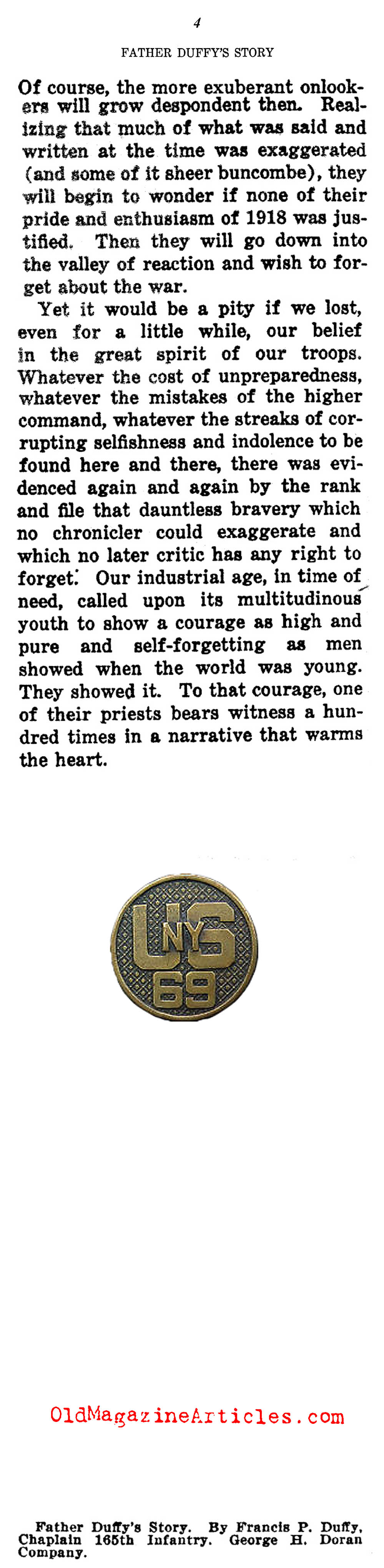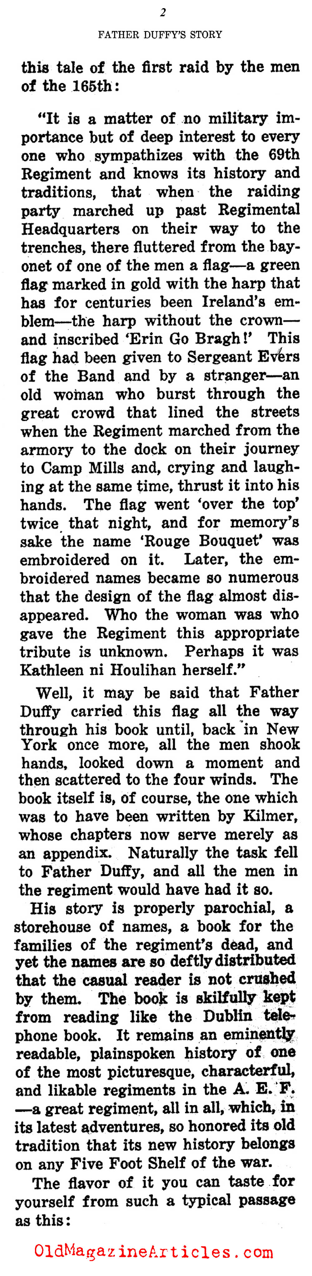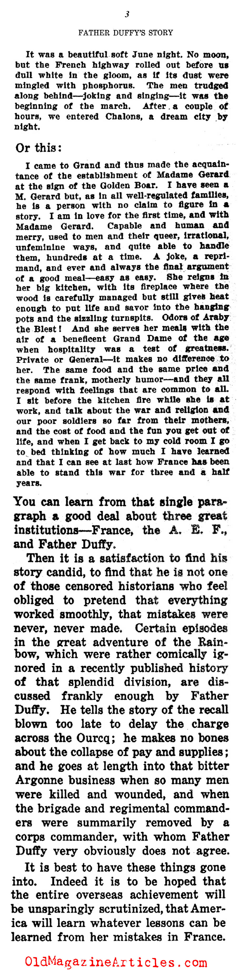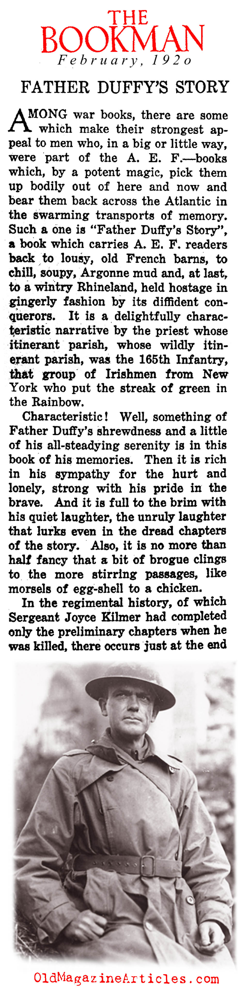 The Bookman summed-up Father Duffy’s W.W. I memoir as “a book which carries A.E.F. readers back to lousy, old French barns, to chilly, soupy Argonne mud and, at last, to a wintry Rhineland…”.