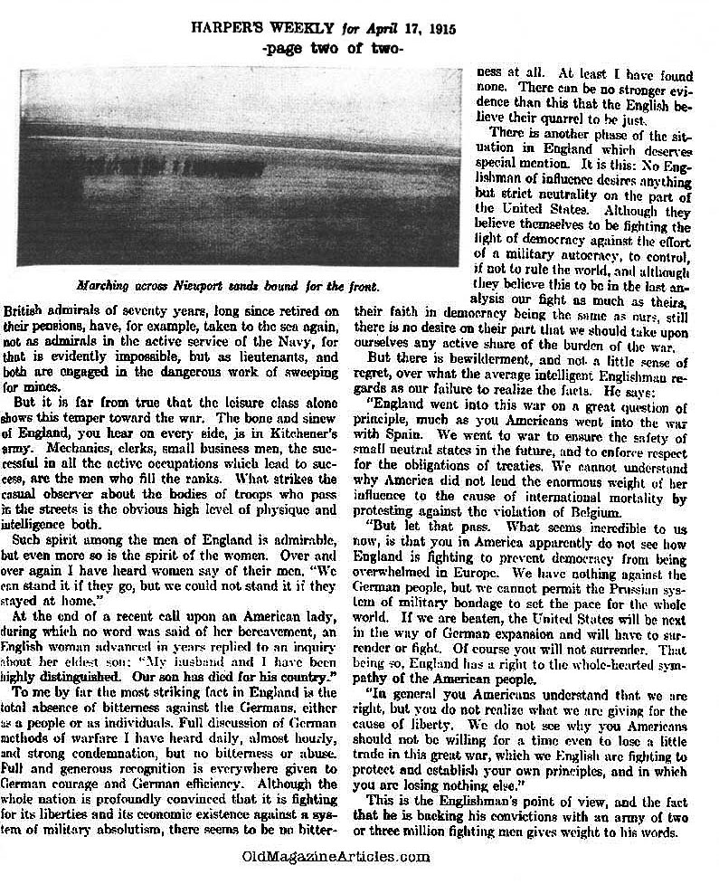 A two page article from HARPER’S WEEKLY concerning life in Britain during the second year of World War One: