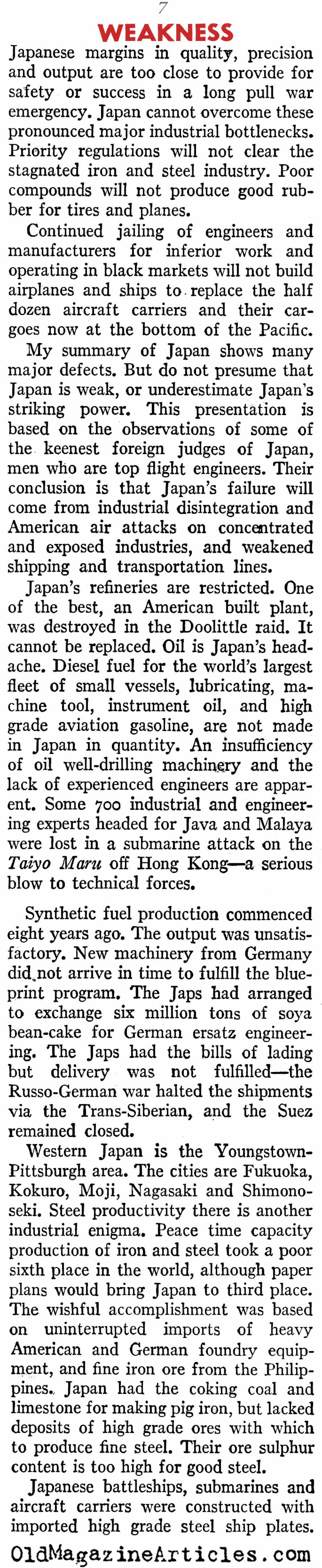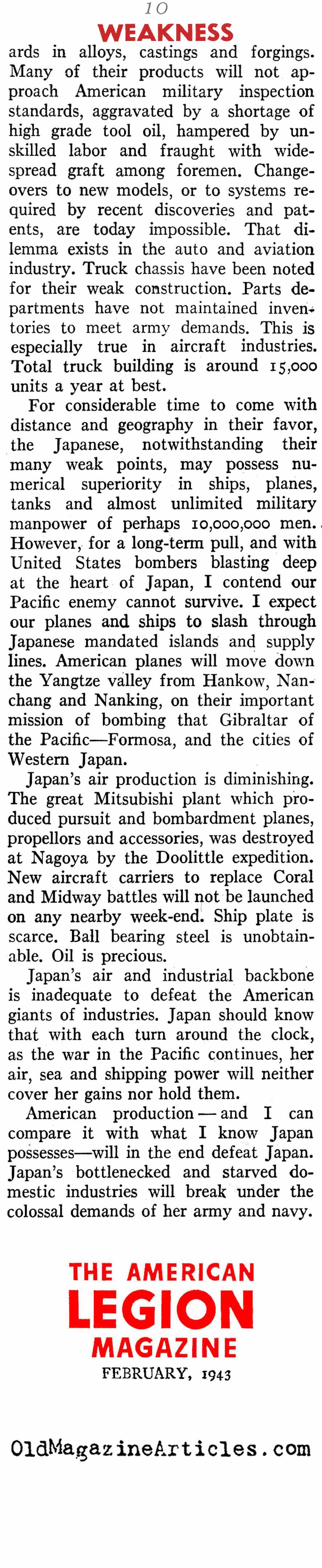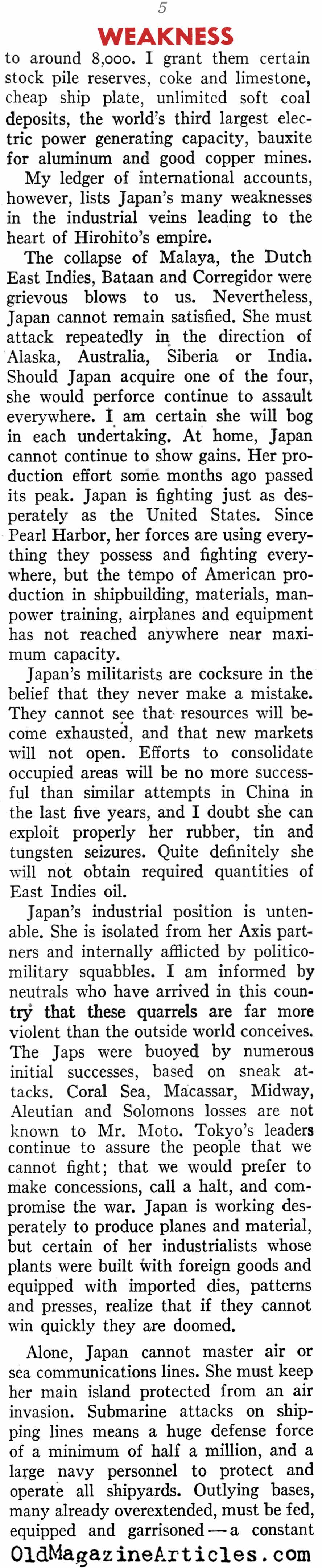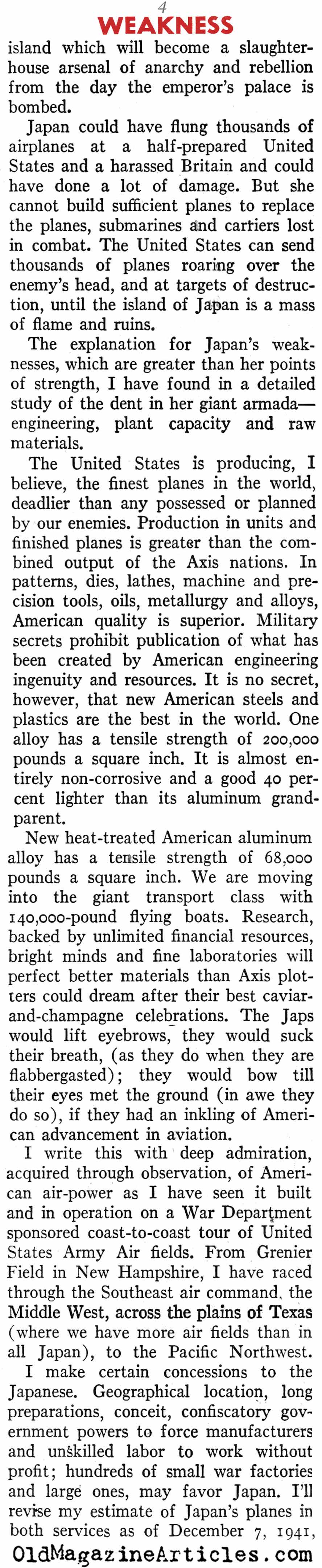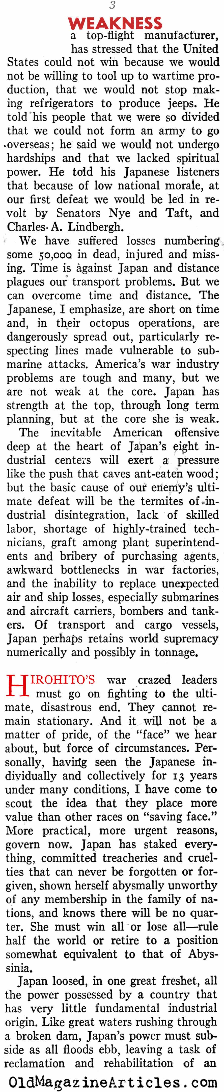 “Japan in the first 13 months of war let loose virtually everything she had against us. Now she’s feeling the pinch, for her lack of industrial capacity makes replacements slow, and she hasn’t the savvy to keep up with her opponents in improving plants and weapons. This is particularly true in the all-important matter of aircraft.”