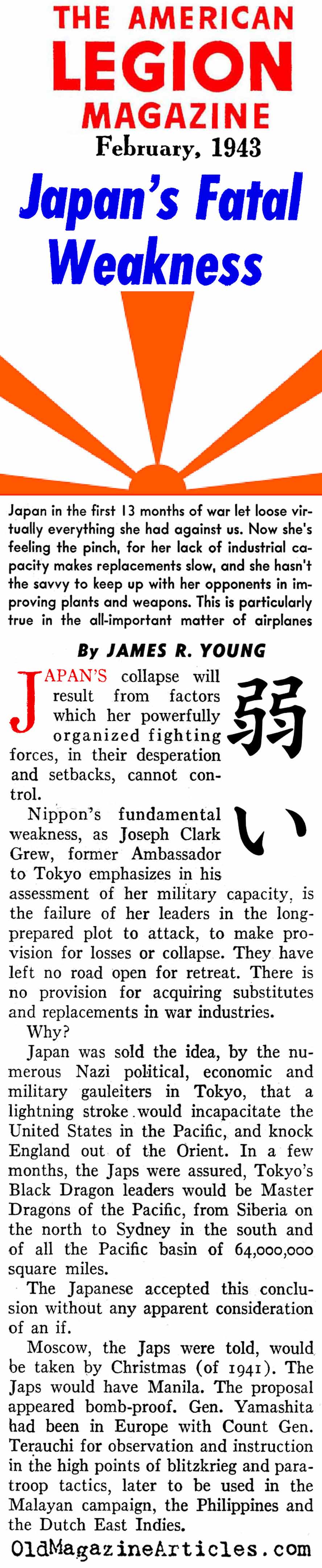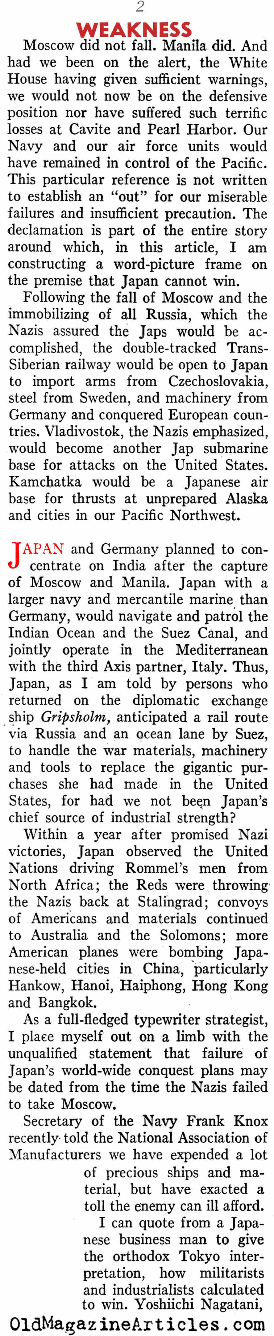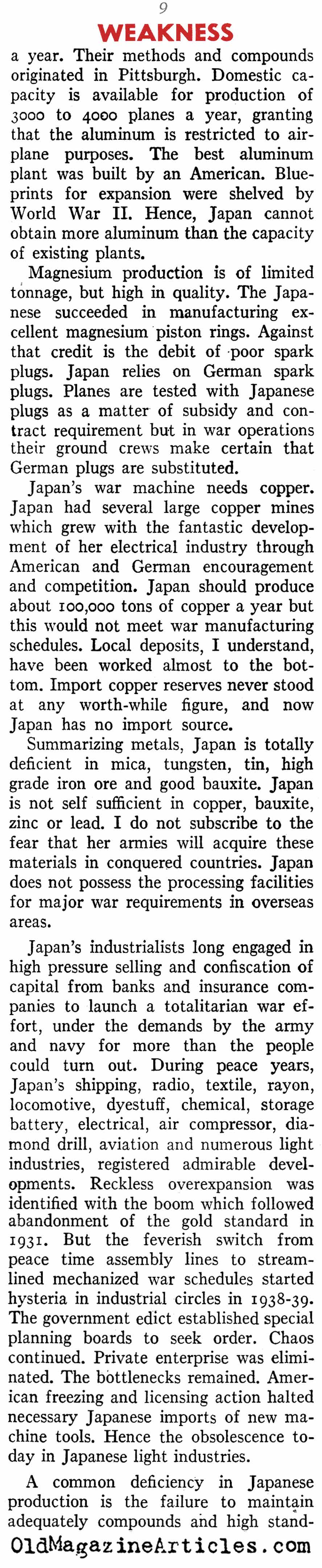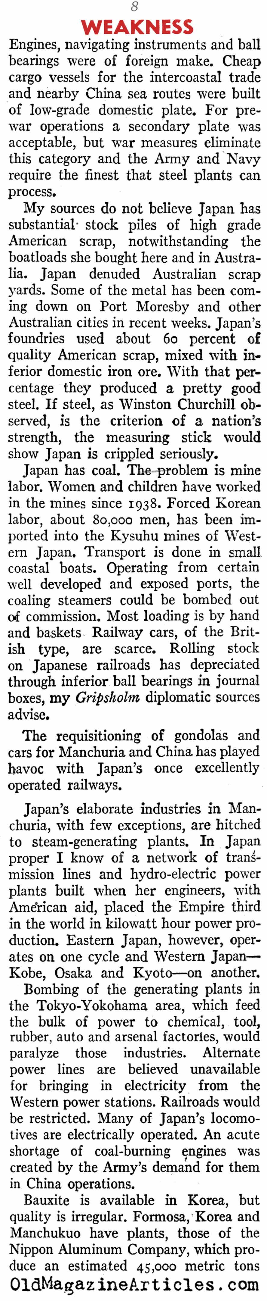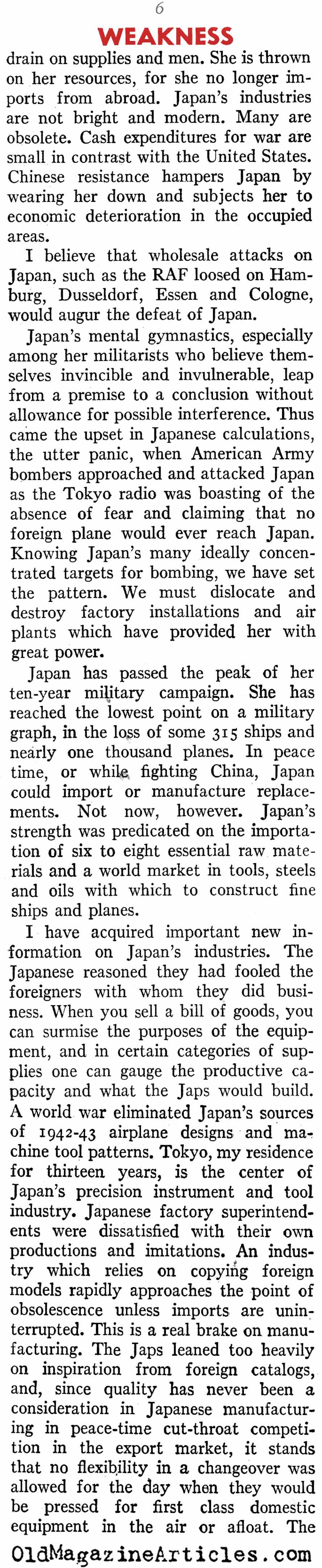 “Japan in the first 13 months of war let loose virtually everything she had against us. Now she’s feeling the pinch, for her lack of industrial capacity makes replacements slow, and she hasn’t the savvy to keep up with her opponents in improving plants and weapons. This is particularly true in the all-important matter of aircraft.”