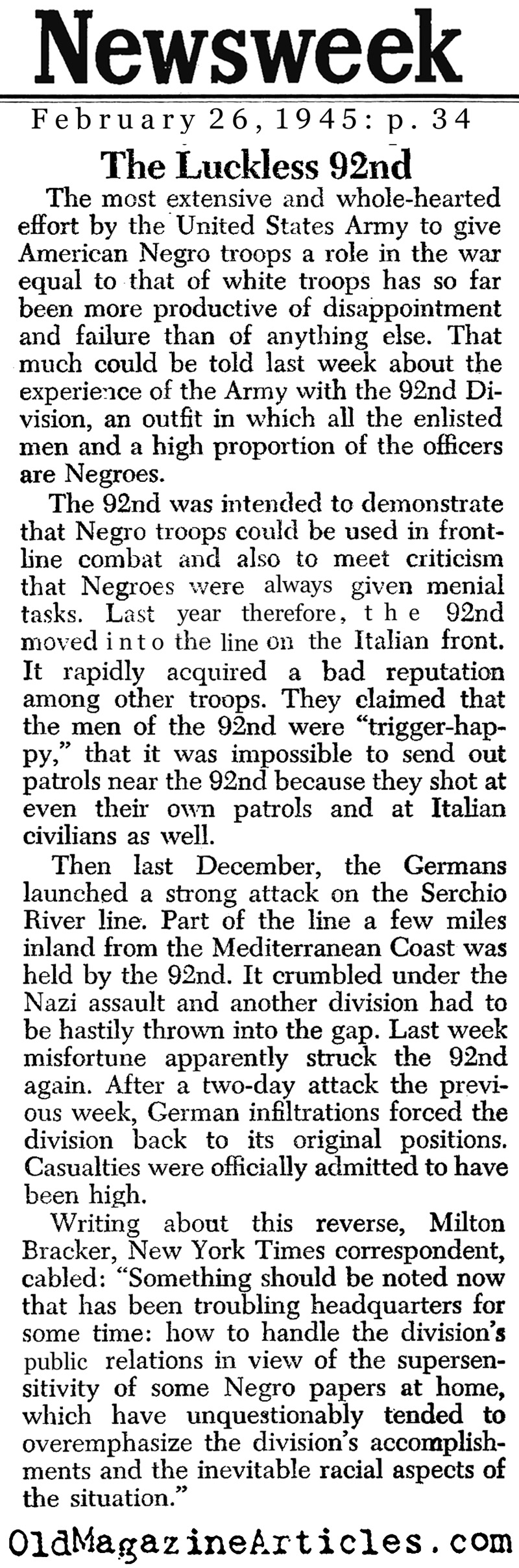 What a thoroughly outrageous article this is! In my experience reading news pieces from both world wars I have never once come across one in which the journalist pinpoints a particular fighting unit and labels it as substandard – but that is exactly what happens in this article about the all-black 92nd Division. Previously, I never thought such a thing would ever happen with a censored press that sought to preserve the morale of both soldiers and home front – but I was wrong.