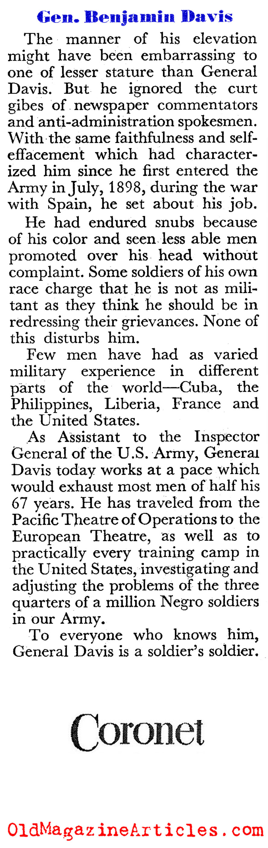 “He had endured snubs because of his color and seen less able men promoted over his head without complaint. Some soldiers of his own race charge that he is not as militant as they think he should be in redressing their grievances. Non of this disturbs him.”