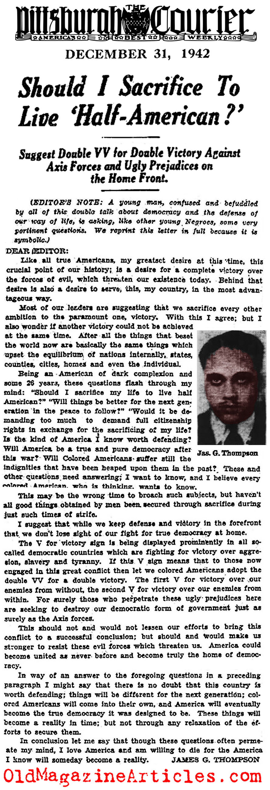 “Should I sacrifice my life to live half American?’ Will things be better for the next generation [of colored Americans] in the peace to follow? ‘Would it be demanding too much to demand full citizenship rights in ex- change for the sacrificing of my life? Is the kind of America I know worth defending? Will America be a true and pure democracy after this war? Will Colored Americans suffer still the indignities that have been heaped upon them in the past? These and other questions need answering; I want to know, and I believe every colored American, who is thinking, wants to know.”