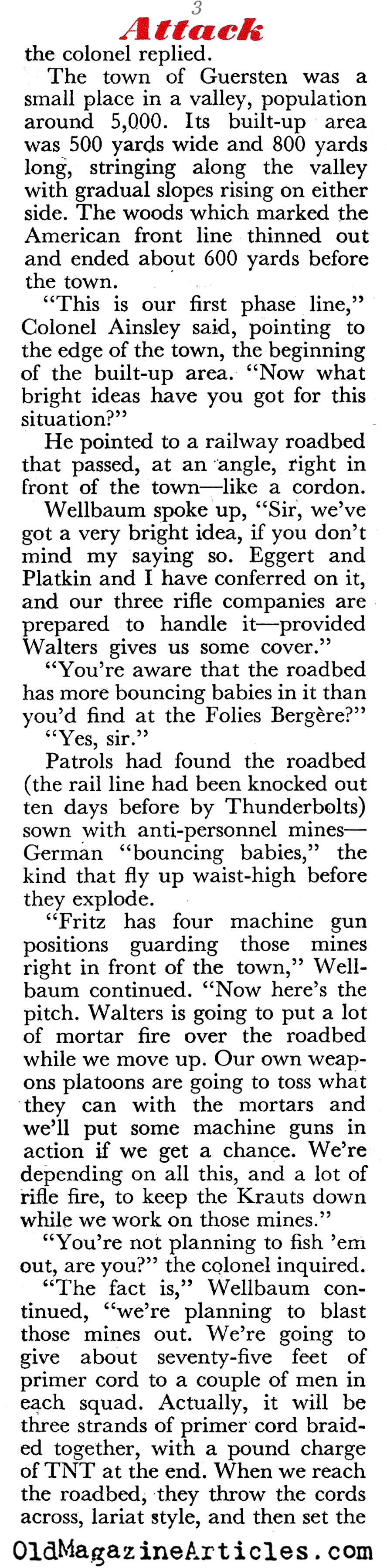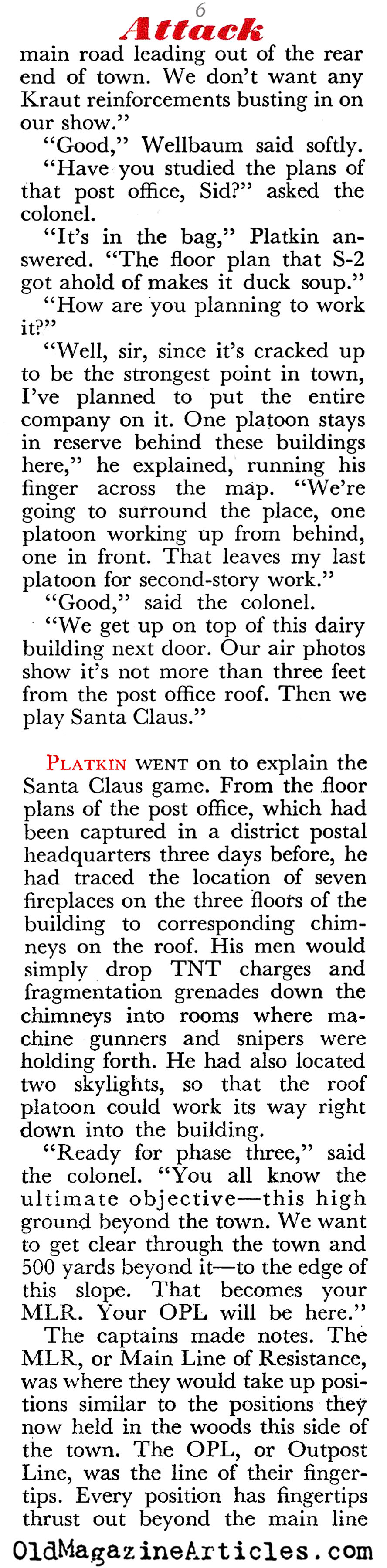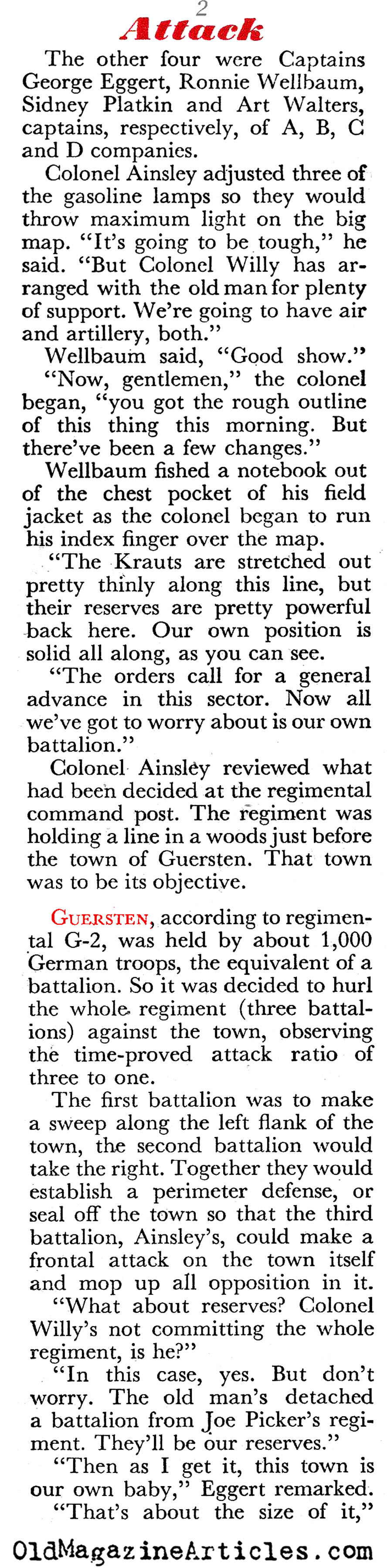 Here is an interesting article from World War Two that goes into some detail explaining what is involved when a lieutenant colonel in an infantry regiment presents his plan of attack on a German town that is heavily defended. We hear him as he addresses the junior officers who will do the heavy lifting, and we get a sense of their concerns. Few reporters have ever paid any attention to this aspect of an assault.