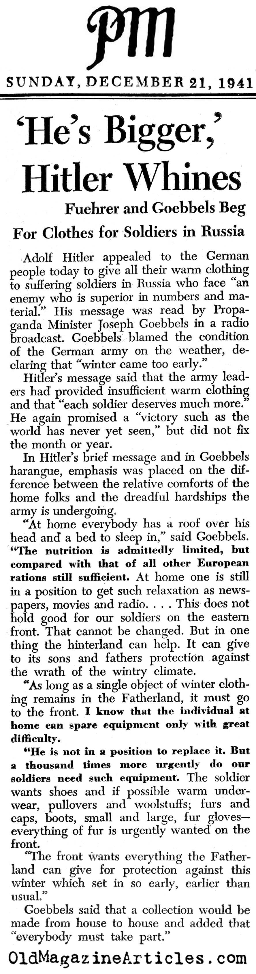 KEY WORDS: German Military Shortages on Russian Front 1941,German Military Shortages on Russian Front included wool and fur,german civilians ordered to surrender long underwear and fur coats to German army on russian front 1941,german home front forced to make up for German military shortages 1941,long underwear needed by German army on russian front 1941,cold weather clothing needed by German army on russian front 1941