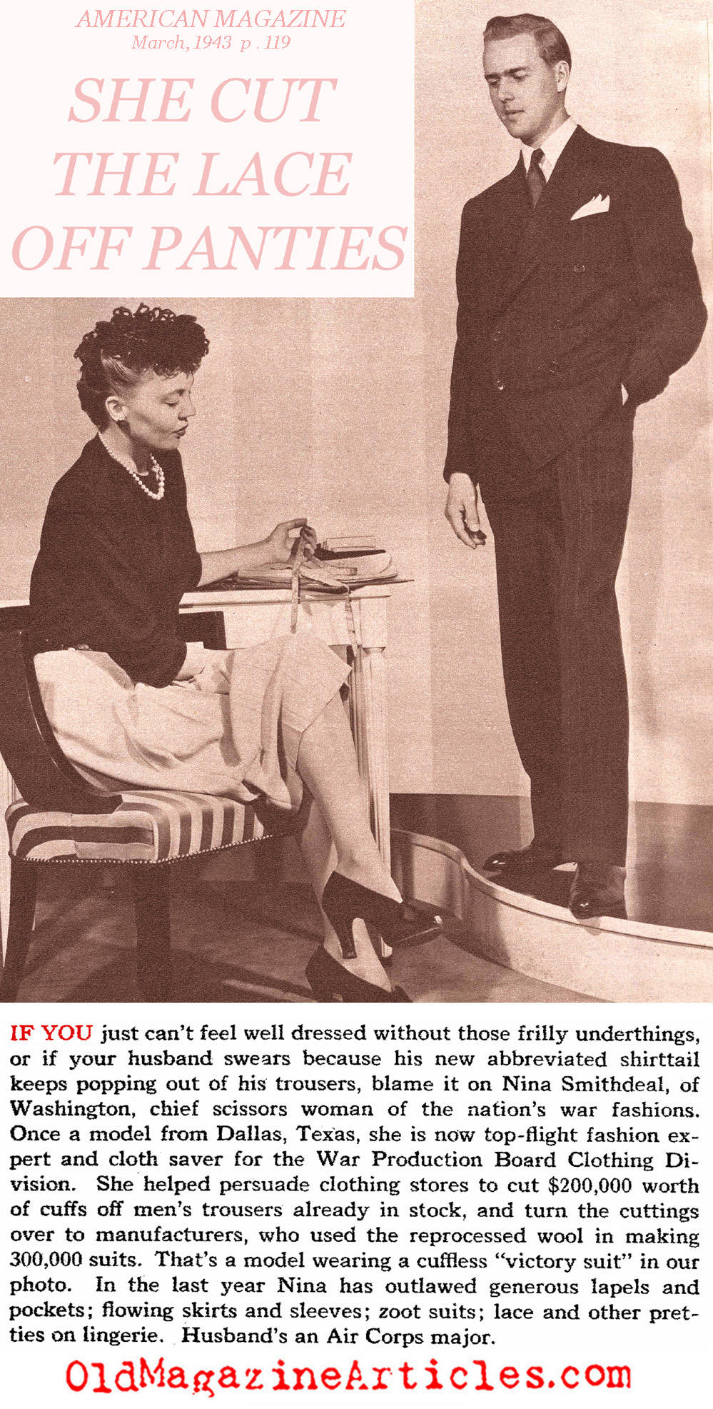 The government bureaucrat who was most responsible for taking the fun out of fashion on the W.W. II home front was a former fashion model and Neiman-Marcus executive named Nina Smithdeal. She is pictured on the right eyeing a model wearing cuffless suit trousers: